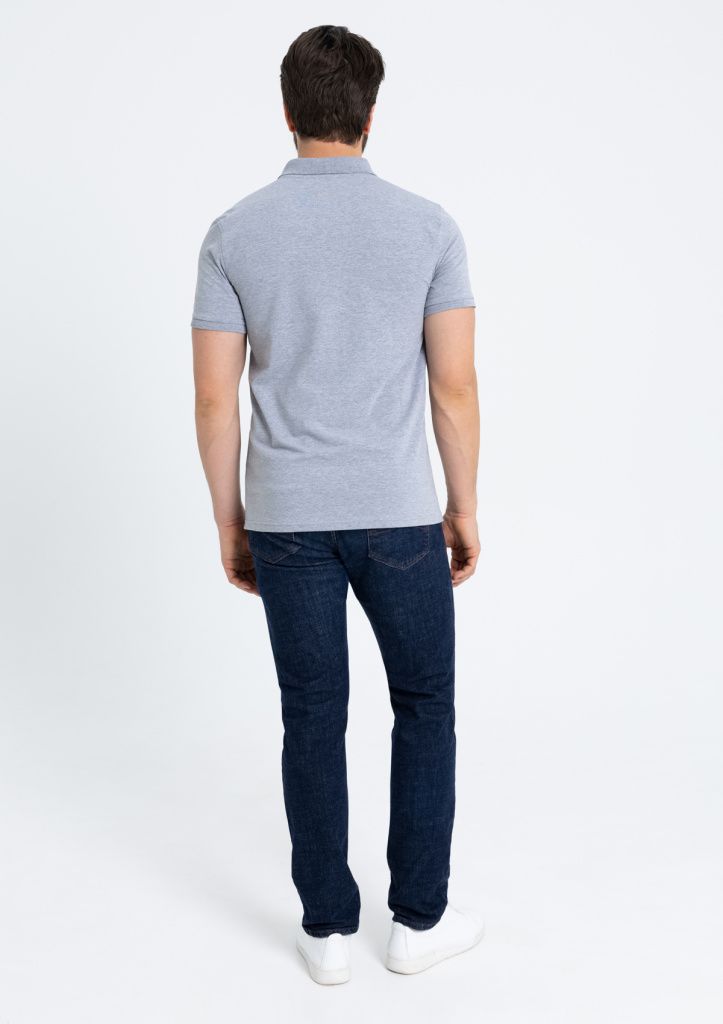 Поло прямого кроя с отложным воротником, втачанным коротким рукавом и застежкой на пуговицы в тон.