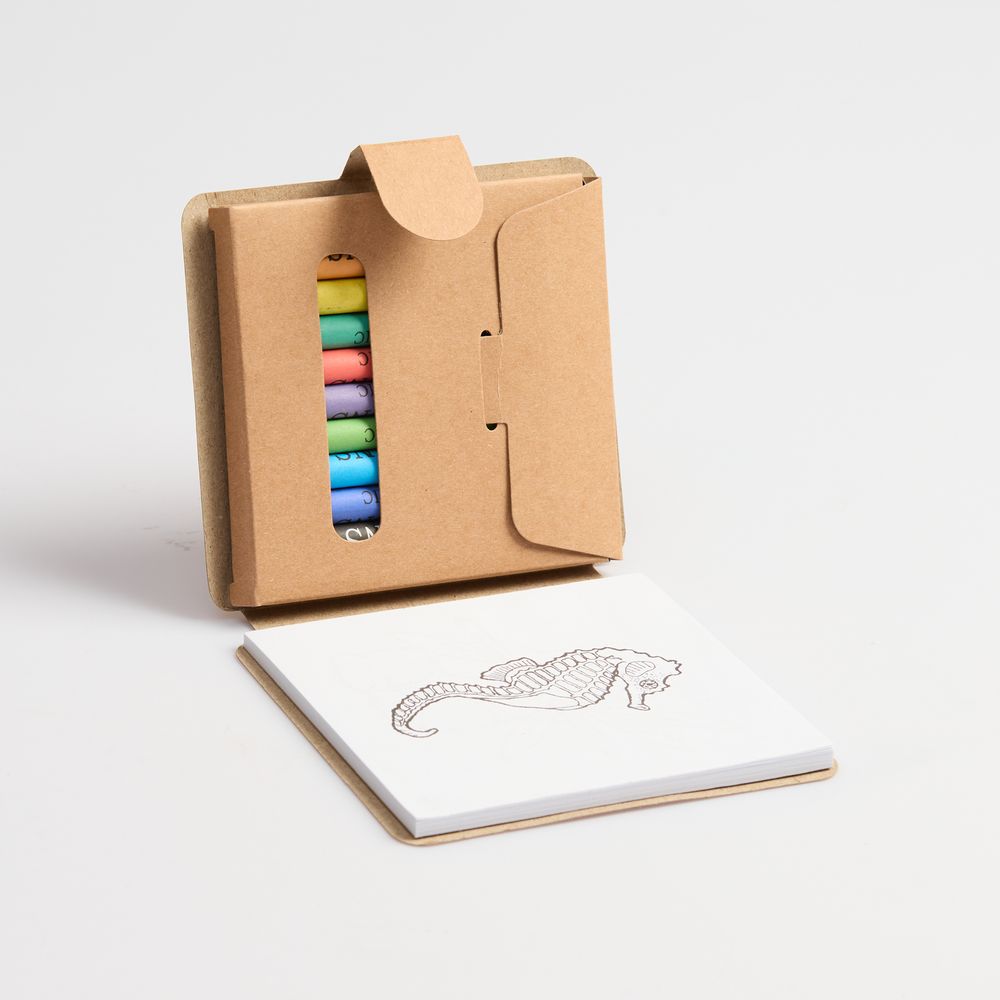 В комплекте 11 цветных восковых мелков и блокнот на 40 страниц для раскрашивания и рисования: 12 страниц с рисунками и 28 чистых страниц. Блокнот и мелки компактно хранятся под одной обложкой.
