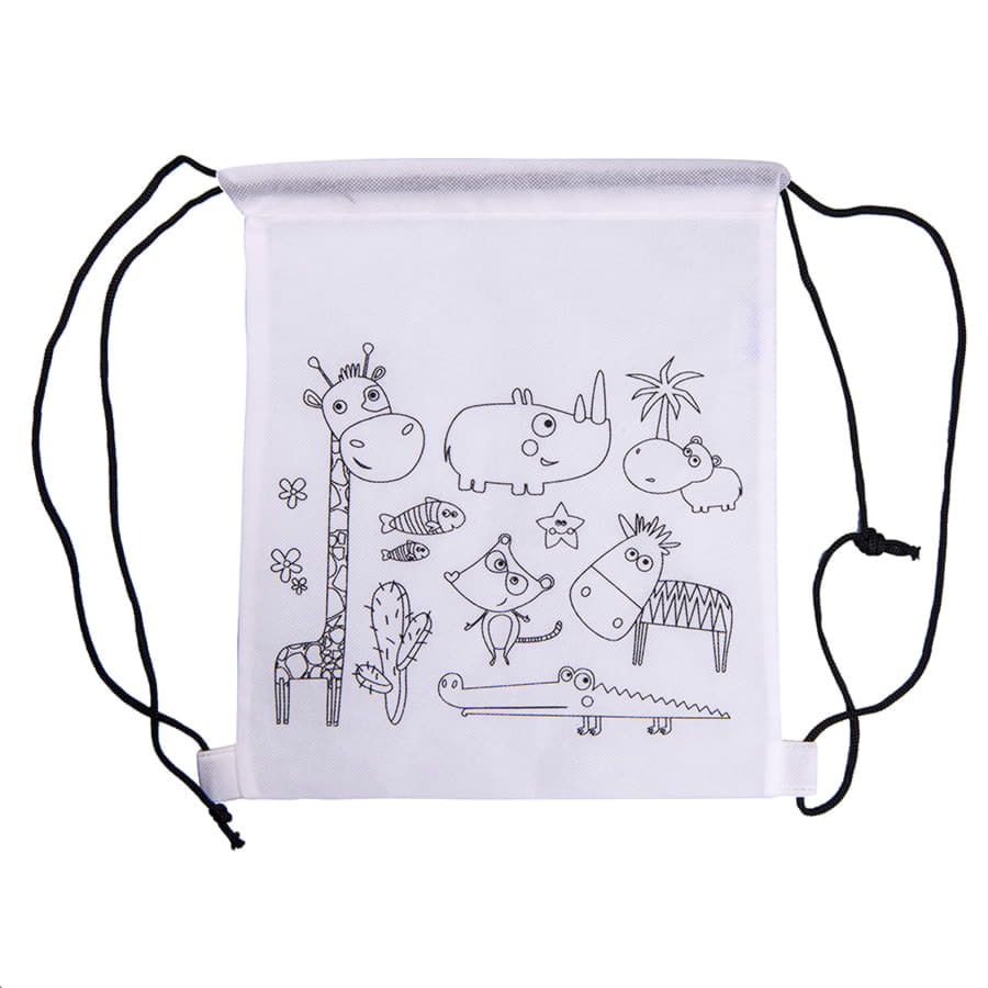 Рюкзак из нетканого материала белого цвета, специально созданный для раскрашивания мелками. В набор входят 5 цветных мелков: синий, красный, зеленый, желтый, черный.Черные ручки-кулисы, усиление по углам. -