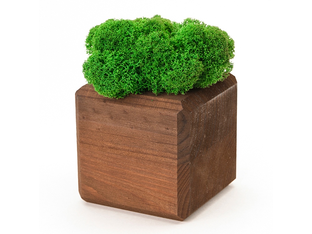 Изделие состоит из стабилизированного мха ягеля, деревянного куба и деревянного упаковочного каркаса. Отталкивает пыль и придает интерьеру индивидуальность. Размер изделия 8х8х13 см. -