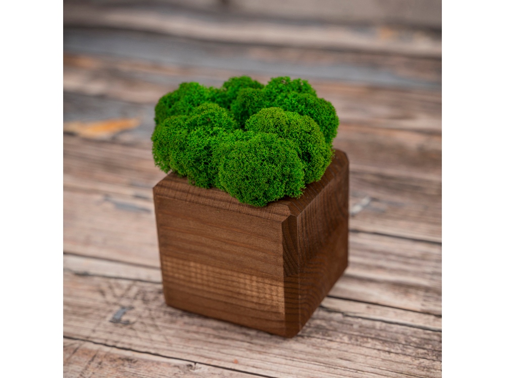 Изделие состоит из стабилизированного мха ягеля, деревянного куба и деревянного упаковочного каркаса. Отталкивает пыль и придает интерьеру индивидуальность. Размер изделия 8х8х13 см.