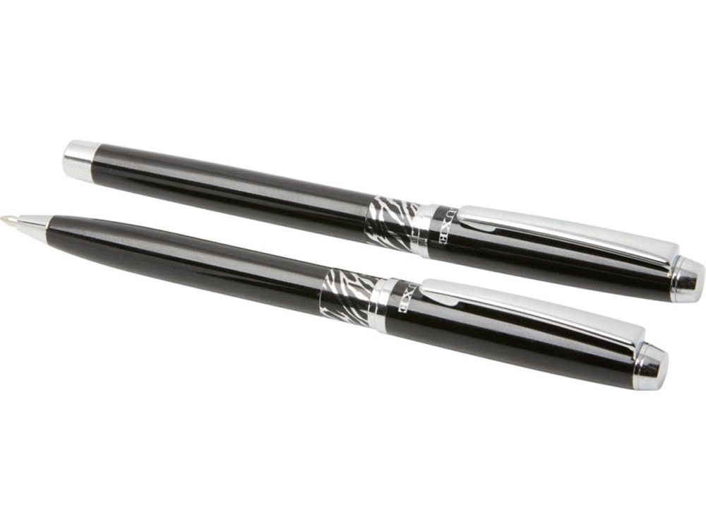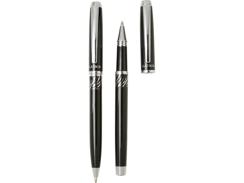 Шариковая ручка и ручка-роллер с декоративным узором на корпусе. Шариковая ручка предварительно заполнена синими чернилами, а ручка-роллер предварительно заполнена черными чернилами. Упакована в подарочную коробку LUXE. Латунь. -
