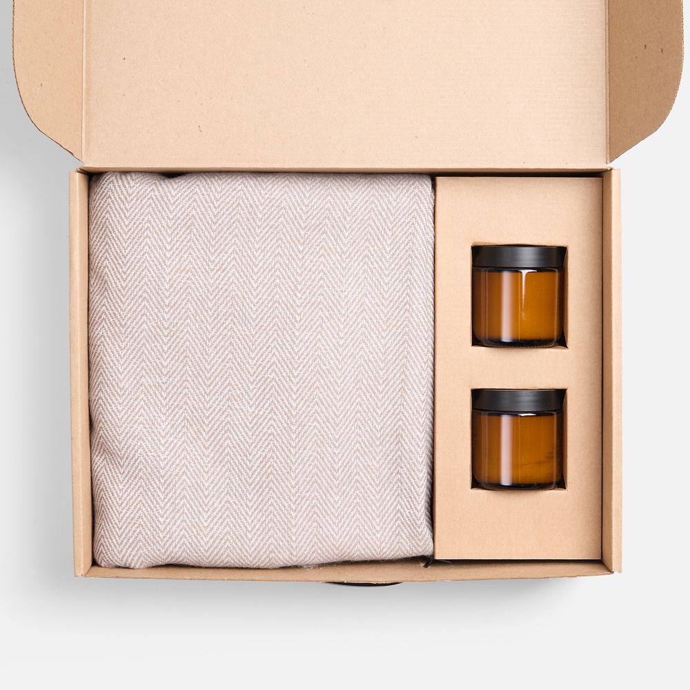 плед - шерсть, 15%; хлопок, 5%; полиэстер, 60%; акрил, 20%, плотность 200 г/кв.м; подсвечник - стекло, крышка - пластик; свеча - парафин, соевый воск, парфюмерная композиция; коробка - микрогофрокартон, Т-23Е