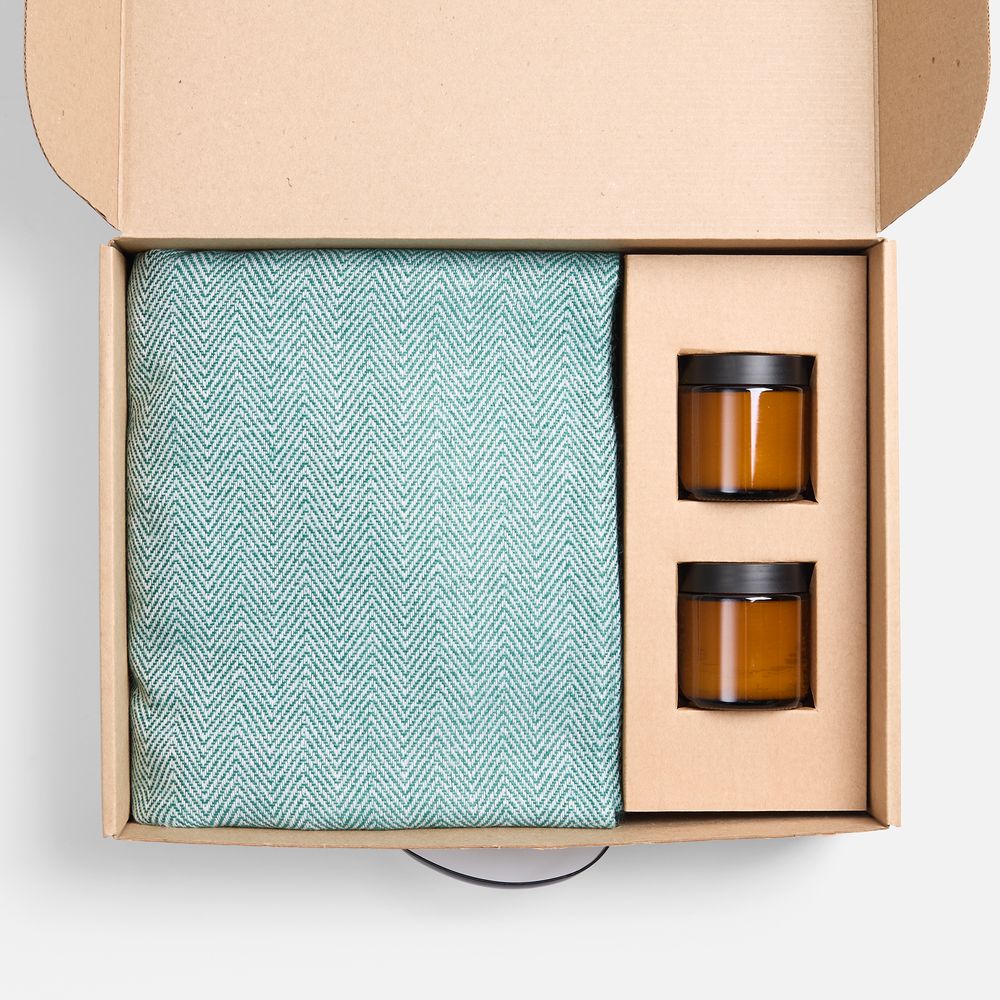 плед - шерсть, 15%; хлопок, 5%; полиэстер, 60%; акрил, 20%, плотность 200 г/кв.м; подсвечник - стекло, крышка - пластик; свеча - парафин, соевый воск, парфюмерная композиция; коробка - микрогофрокартон, Т-23Е