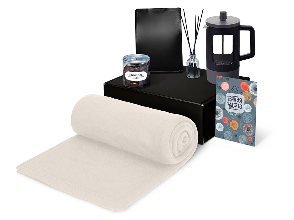 плед - флис, полиэстер, кофе - пластик, френч-пресс - нержавеющая сталь, боросиликатное стекло, ПП пластик, диффузор - стекло, миндаль - пластик, мешок - нетканый материал (спанбонд), коробка - картон