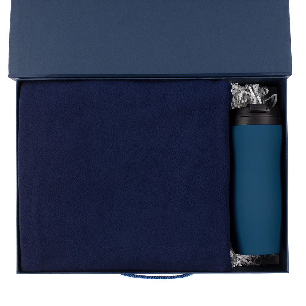 термостакан - пластик, крышка, внутренняя колба; нержавеющая сталь, корпус; покрытие софт-тач; плед - флис, плотность 180 г/кв.м; коробка - переплетный картон; наполнитель - бумага