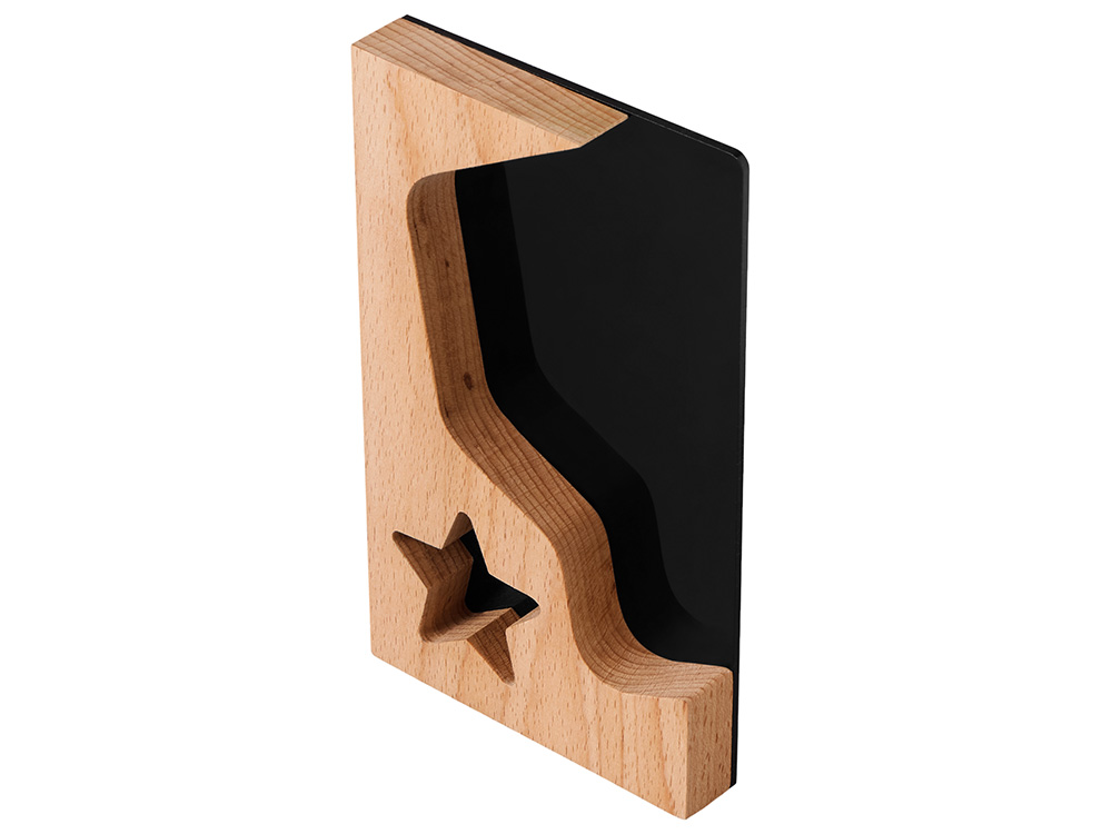 Красивая и современная награда для главных звезд любой компании. Черный акрил добавляет контраста рамке из бука, логотип или наградную надпись можно выгравировать на деревянной части или сделать уникальный дизайн, благодаря полной запечатке акрила методом УФ-печати. -