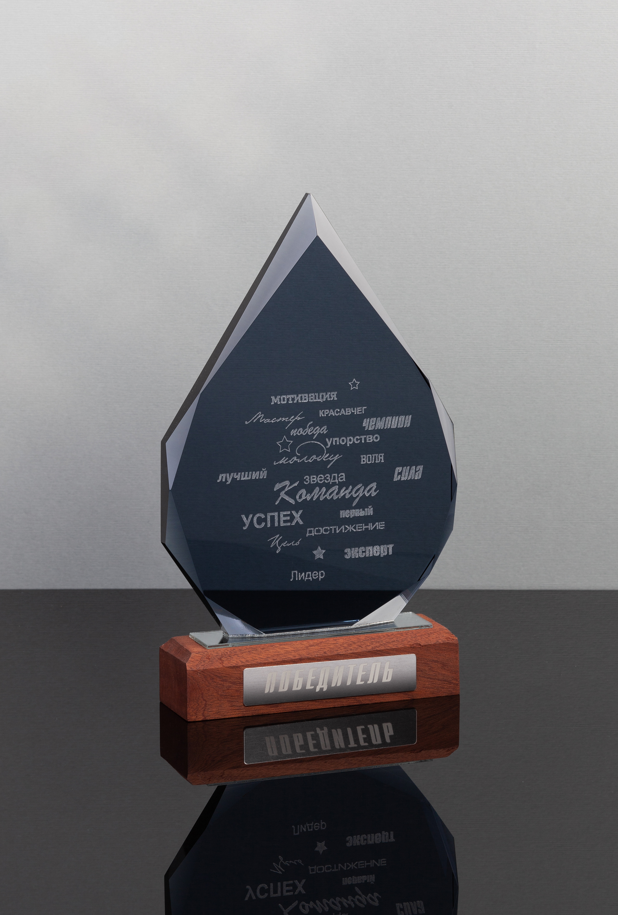 «Капля» представлена в тёмном стекле, на подставке из натурального дерева (палисандр), с возможностью персонализации на стекле или шильде. Символичное напоминание о личном вкладе в большое (общее) дело.