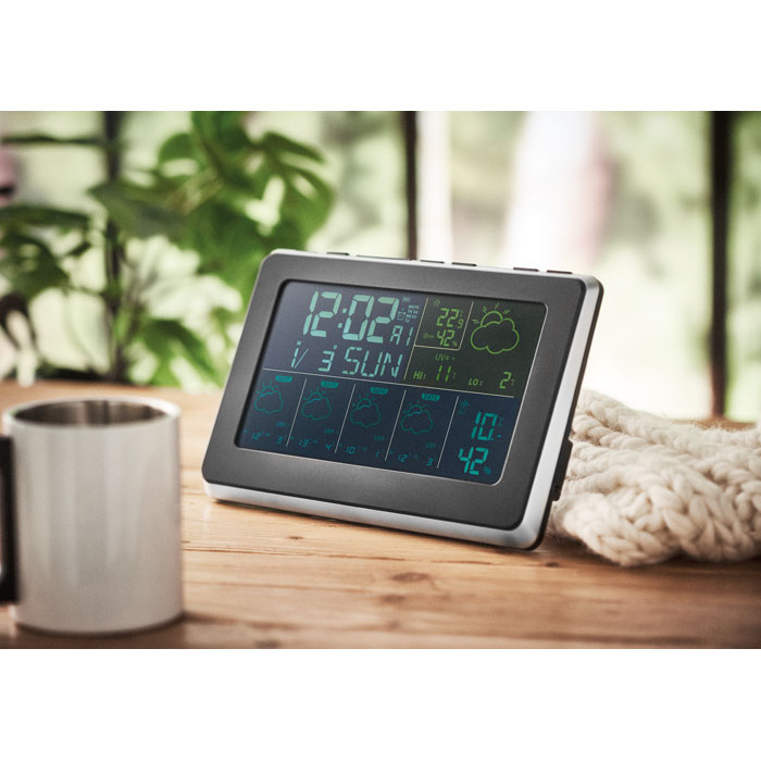 Wi-Fi метеостанция с цветным дисплеем. Отображает температуру (внутри и снаружи), время, прогноз погоды, будильник. 5 батареек типа ААА в комплект не входят. В комплект входит адаптер AC-DC и датчик наружной температуры. Требуется бесплатное приложение (TUYA Smart доступно для iOS и Android). -