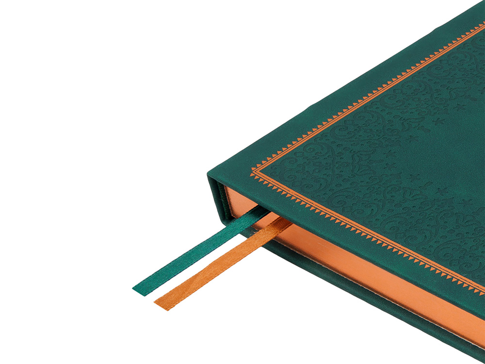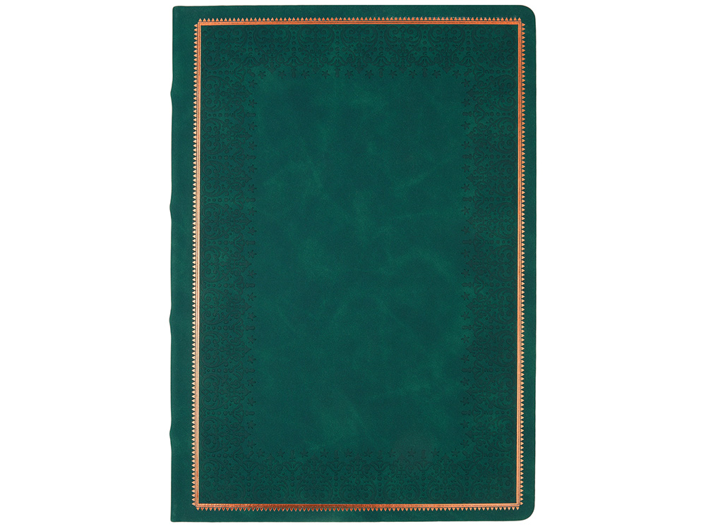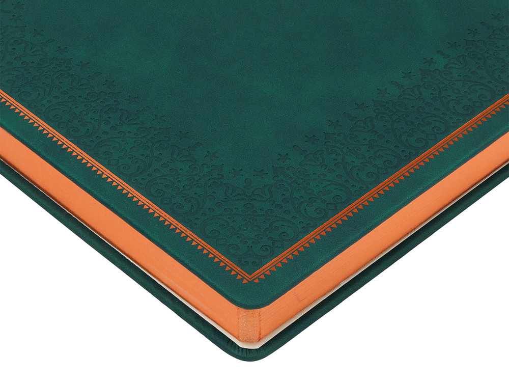 Недатированный ежедневник Royal формата А4 с твердой обложкой из искусственной кожи с имитацией нубука украшен художественным бронзовым и блинтовым тиснением. Внутри 192 страницы, выполненные из качественной бежевой бумаги в линейку плотностью 140 г/м². Два шелковых ляссе в цвет обреза блока и обложки облегчают навигацию по записям. Французский корешок дополнительно декорирован изящным бронзовым тиснением в виде виньеток. Скругленные углы обложки и блока подчеркивают стильный дизайн изделия, а блеск бронзового обреза дарит ежедневнику благородный и роскошный внешний вид. -