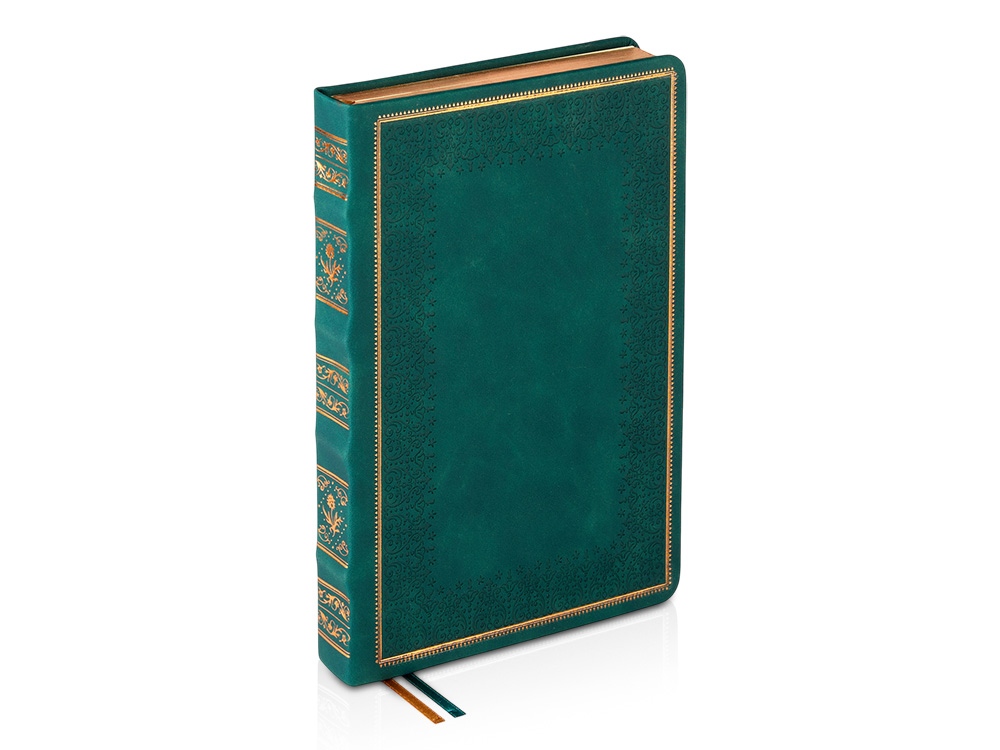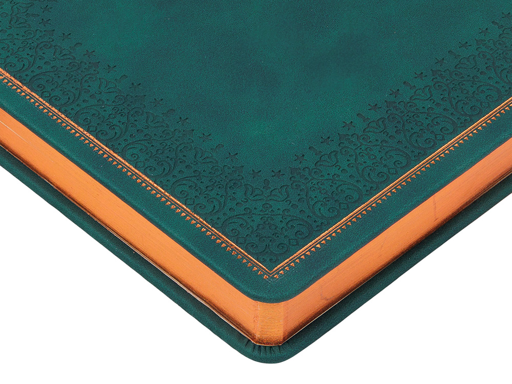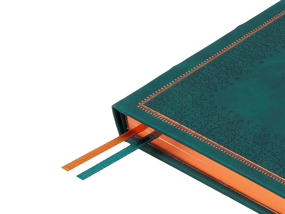 Недатированный ежедневник Royal формата А5 с твердой обложкой из искусственной кожи с имитацией нубука украшен художественным бронзовым и блинтовым тиснением. Внутри 256 страниц, выполненных из качественной бежевой бумаги в линейку плотностью 100 г/м². Два шелковых ляссе в цвет обреза блока и обложки облегчают навигацию по записям. Французский корешок дополнительно декорирован изящным бронзовым тиснением в виде виньеток. Скругленные углы обложки и блока подчеркивают стильный дизайн изделия, а блеск бронзового обреза дарит ежедневнику благородный и роскошный внешний вид. -