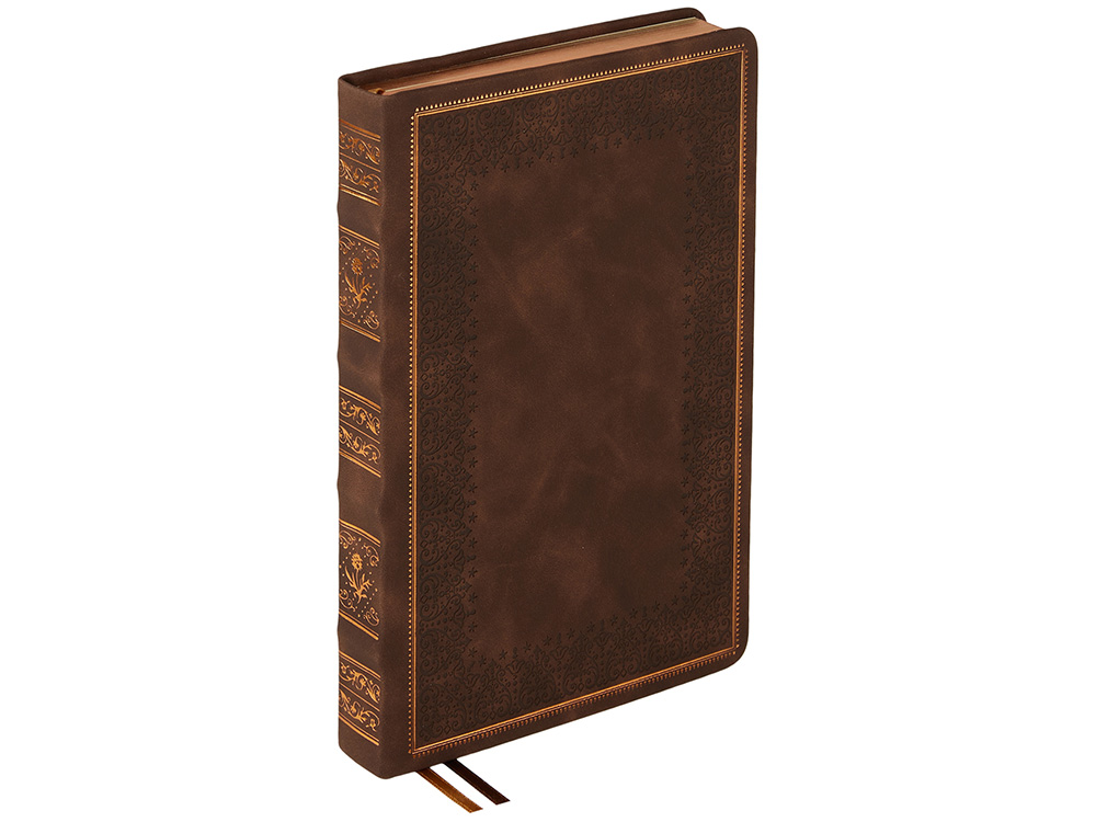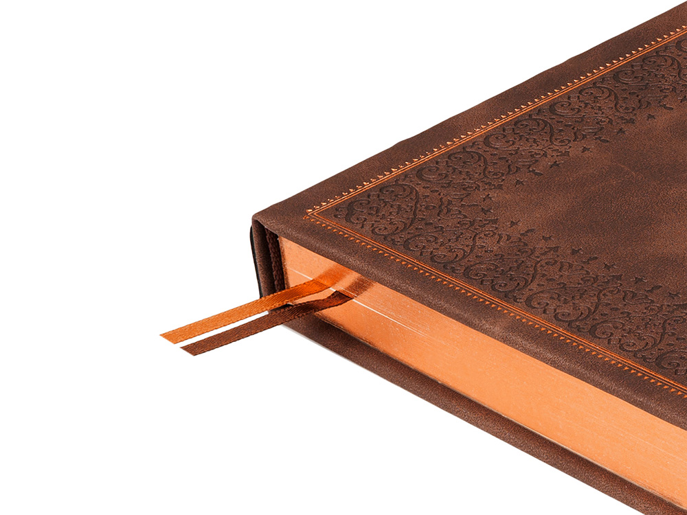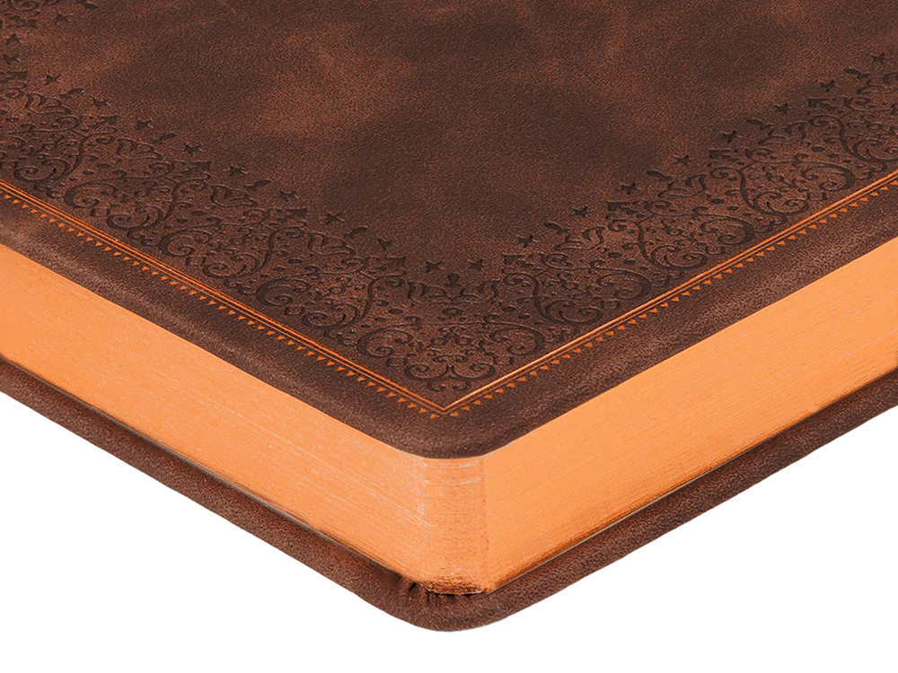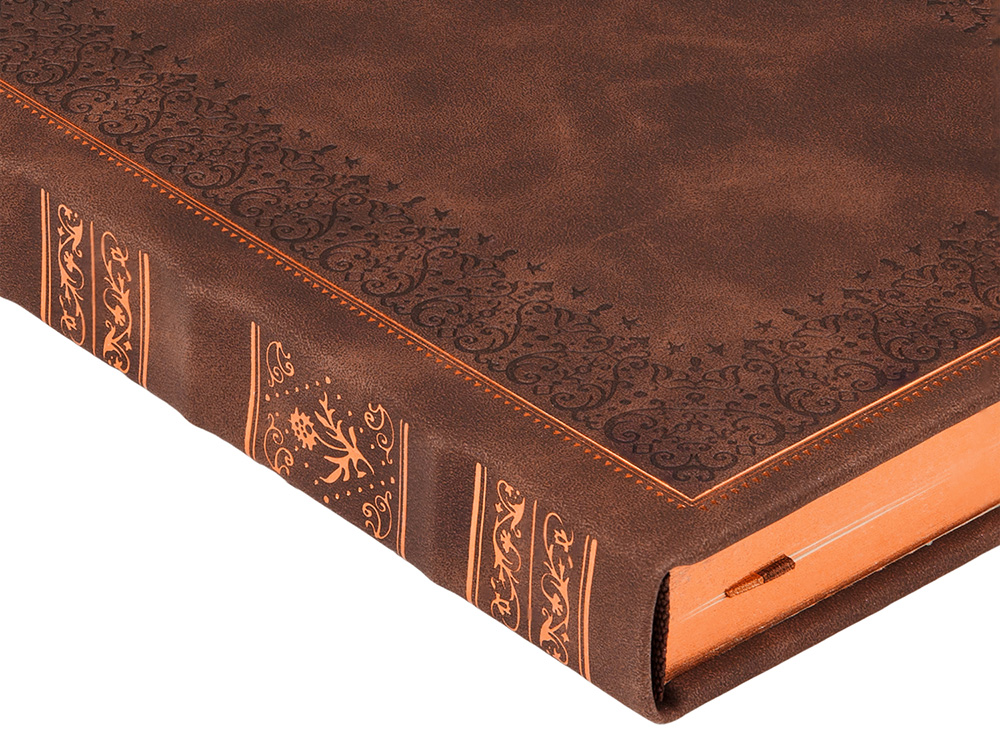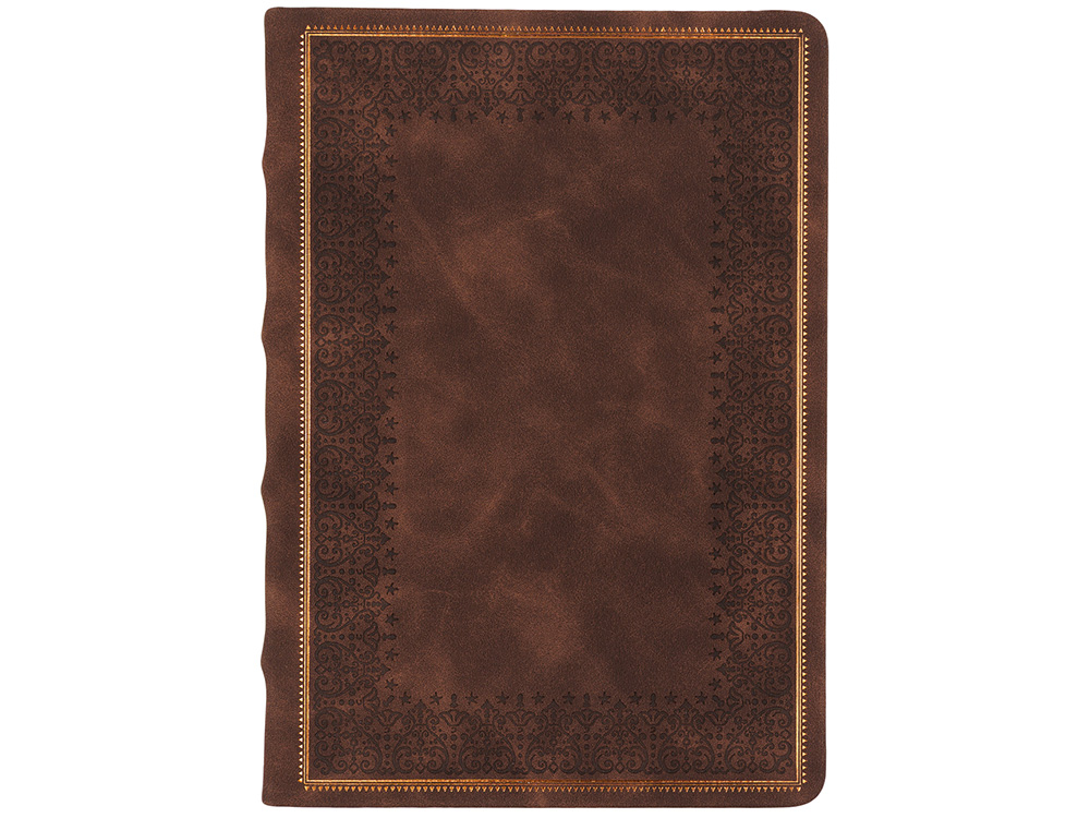 Недатированный ежедневник Royal формата А5 с твердой обложкой из искусственной кожи с имитацией нубука украшен художественным бронзовым и блинтовым тиснением. Внутри 256 страниц, выполненных из качественной бежевой бумаги в линейку плотностью 100 г/м². Два шелковых ляссе в цвет обреза блока и обложки облегчают навигацию по записям. Французский корешок дополнительно декорирован изящным бронзовым тиснением в виде виньеток. Скругленные углы обложки и блока подчеркивают стильный дизайн изделия, а блеск бронзового обреза дарит ежедневнику благородный и роскошный внешний вид. -
