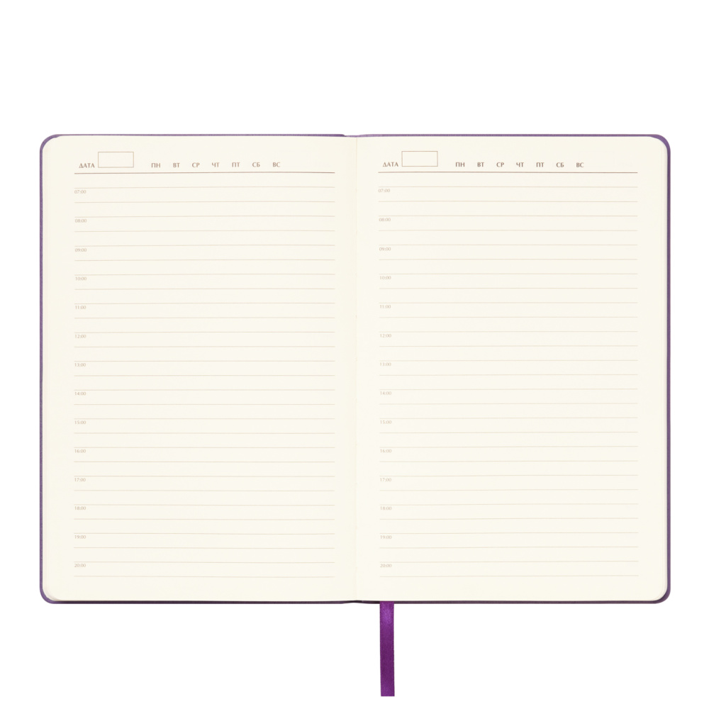 Матовое покрытие Soft Touch с деликатным пудровым эффектом подарит неповторимое тактильное удовольствие. А кремовые форзац, нахзац и срез блока создадут гармоничное обрамление для гладких шелковистых страниц кремового оттенка. Элегантное атласное ляссе поможет вам легко ориентироваться в записях.