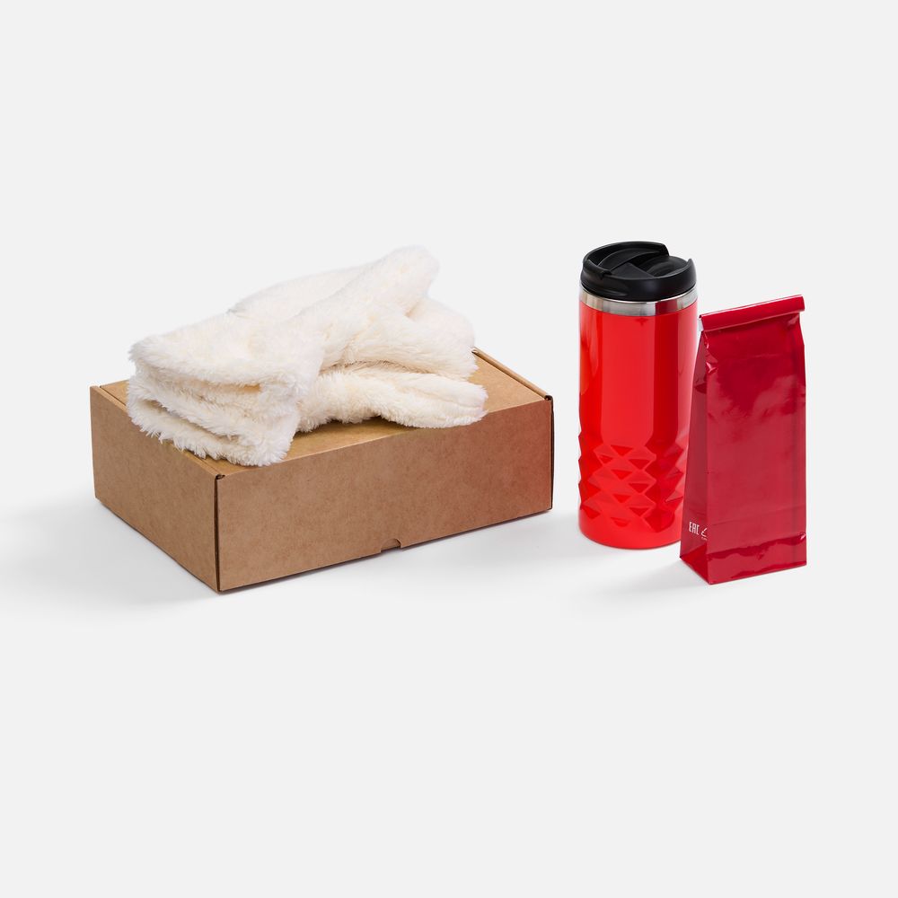 термостакан, крышка - пластик; внутренняя стенка - нержавеющая сталь; варежки - полиэстер 100%, плотность 280 г/кв.м, длинноворсовый флис; коробка - микрогофрокартон