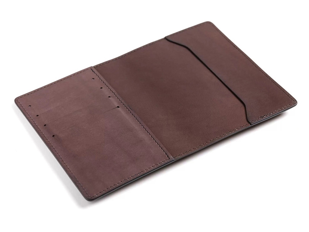 Классическая обложка из дублированной кожи, прокрашенные края, аккуратный шов, прорези для четырёх карт, место для паспорта и документов на машину. -