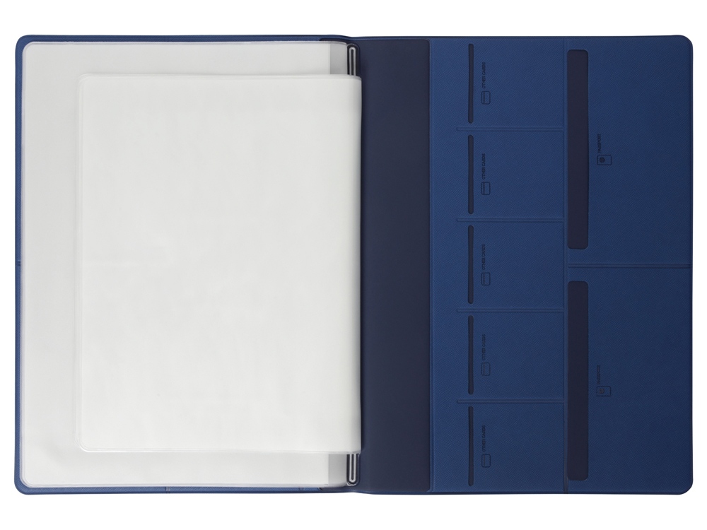 Обложка выполнена из экокожи, имеет внутренний слой из бархатистого материала и разбита на множество карманов: два больших кармана-отделения А4, 6 горизонтальных кармана с подписями и иконками, уточняющими тип документа, который можно поместить внутрь, пять карманов под визитки или кредитные карты. -