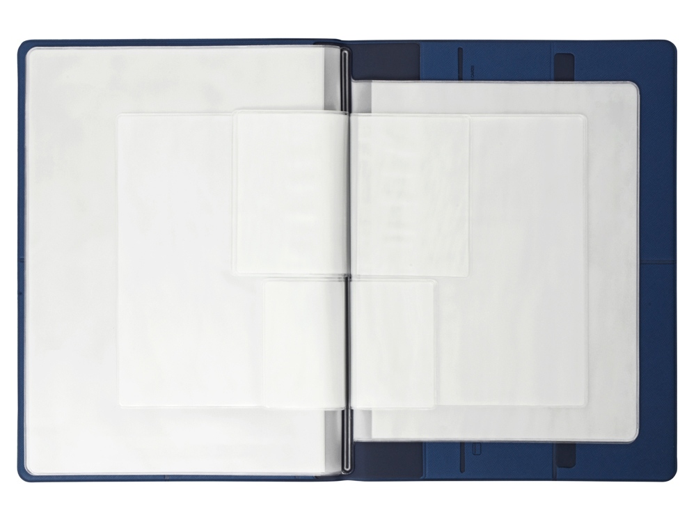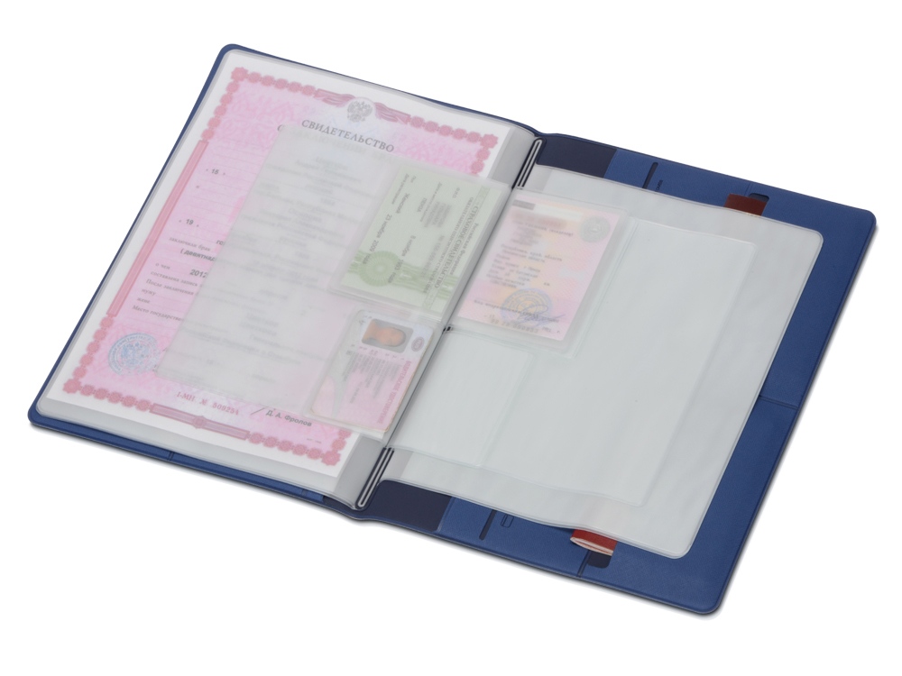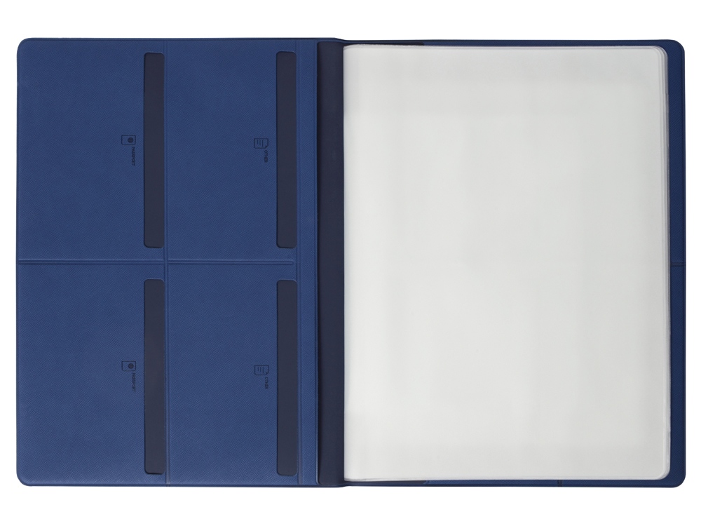 Обложка выполнена из экокожи, имеет внутренний слой из бархатистого материала и разбита на множество карманов: два больших кармана-отделения А4, 6 горизонтальных кармана с подписями и иконками, уточняющими тип документа, который можно поместить внутрь, пять карманов под визитки или кредитные карты.