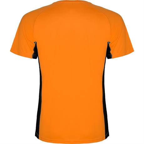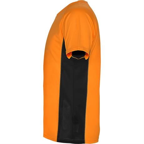 Спортивная футболка с короткими рукавами реглан, изготовленная из двух комбинированных тканей из полиэстера. Основная ткань — ткань bird's eye, а боковые вставки и рукав с внутренней стороны — с микроперфорированной ткани. Круглая горловина с усиленными- Цвет: Флуоресцентный оранжевый/Черный