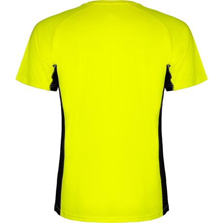 Спортивная футболка с короткими рукавами реглан, изготовленная из двух комбинированных тканей из полиэстера. Основная ткань — ткань bird's eye, а боковые вставки и рукав с внутренней стороны — с микроперфорированной ткани. Круглая горловина с усиленными- Цвет: Флуоресцентный желтый/Черный