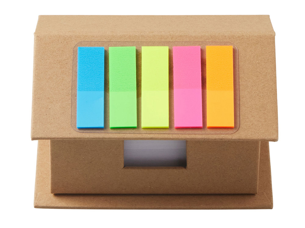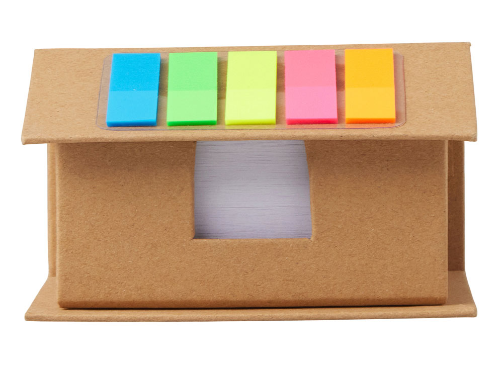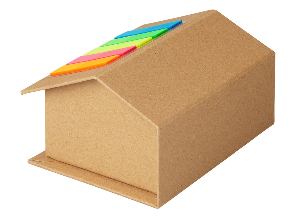 Набор стикеров и бумаг для записи в виде домика. На крыше домика расположены стикеры, 5 цветов по 25 штук каждого цвета. Внутри домика - 400 листов белой бумаги для записей плотностью 70 г/м2. -