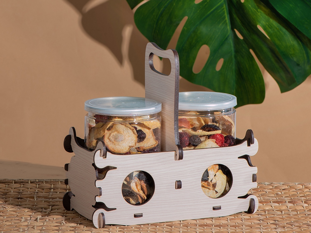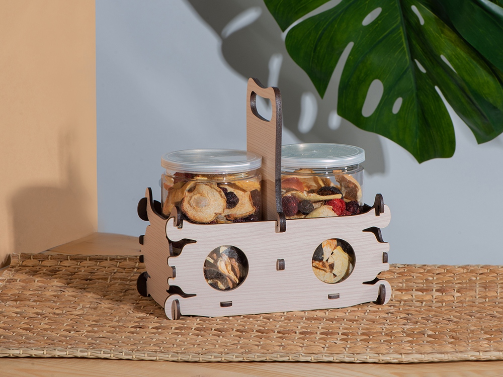 Мы красиво упаковали этот набор в корзинку-переноску из переработанной древесины, которую можно брендировать несколькими методами, и которая станет полезным, красивым и долговечным аксессуаром в доме. Чипсы упакованы в брендируемые наклейками пластиковые банки, которые можно использовать для хранения любых пищевых и непищевых предметов благодаря удобной форме и наличию плотно закрывающейся полиэтиленовой крышки. -