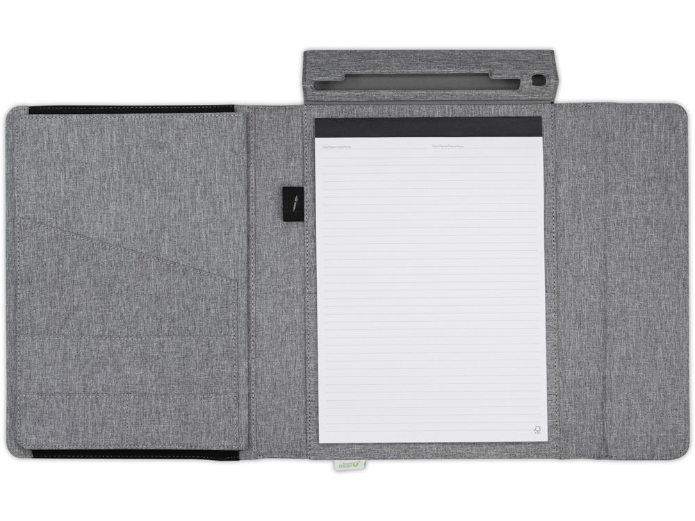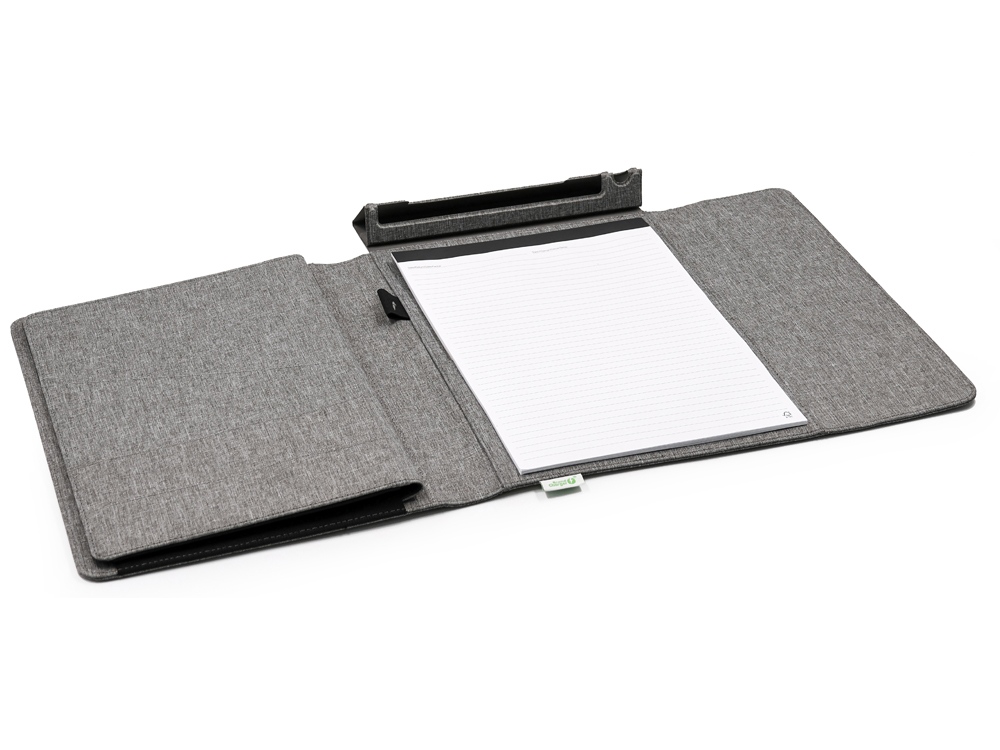 Обложка выполнена из переработанного пластика (RPET). Внутри папки 20 листов FSC бумаги плотностью 80 г/м2, изготовленной с соблюдением экологических норм.