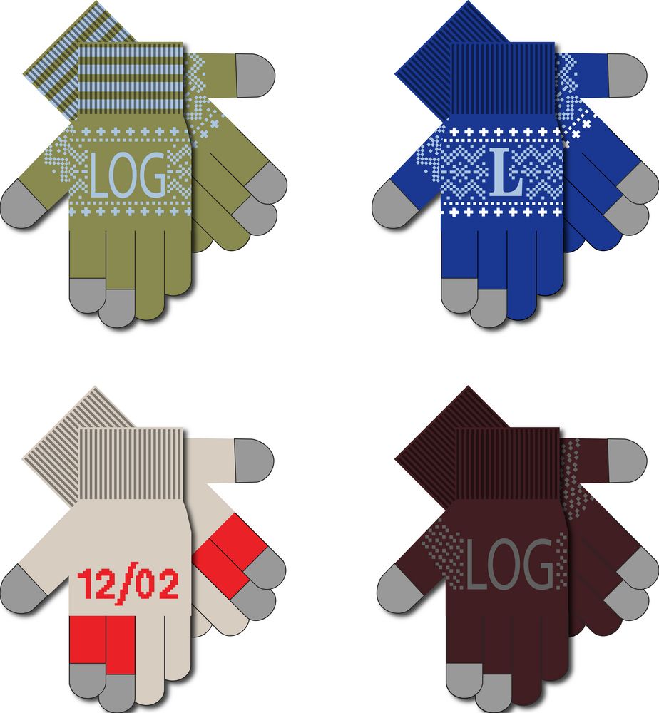 Модель: цельновывязанные бесшовные перчатки с эластичной манжетой и жаккардовым узором в 2-3 цвета. Три пальца: средний, указательный, большой — вяжутся с использованием токопроводящей нити. Манжета может быть полосатой (только горизонтальные полосы 1-2 цветов, без узора и логотипа).