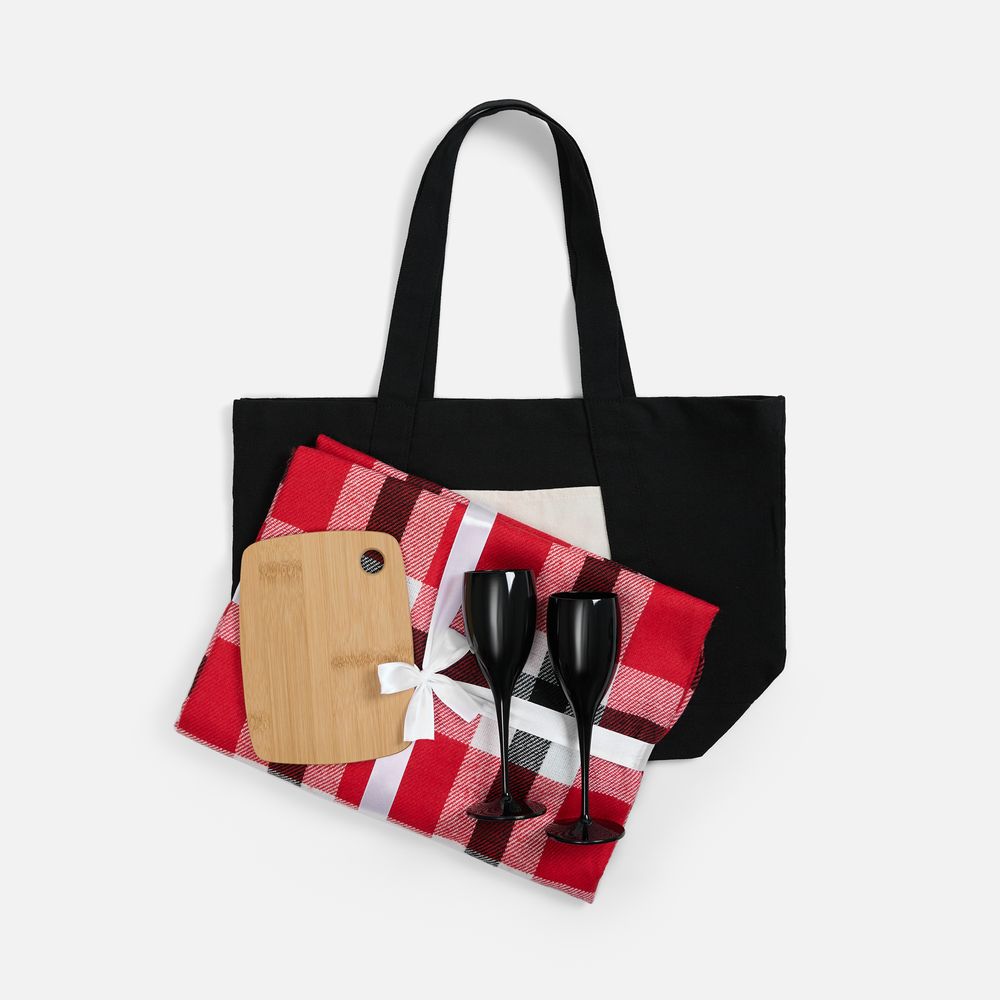 плед - шерсть 15%; хлопок 5%; полиэстер 60%; акрил 20%, плотность 200 г/кв.м; шопер - полиэстер 60%, переработанный хлопок 40%, плотность 340 г/кв.м; бокалы - пластик; доска - бамбук