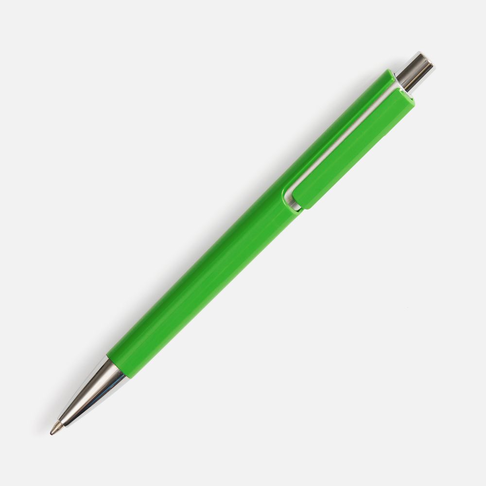 Шариковая ручка с цветным глянцевым корпусом и акцентными серебристыми деталями.- Механизм ручки: нажимной.