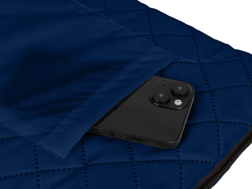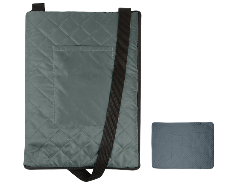 Двухсторонний плед с водоотталкивающим покрытием с одной стороны и мягким флисом с другой. Складывается в сумку на плечо и фиксируется с помощью молнии. В собранном виде имеет регулируемый по длине ремень для переноски и наружный карман для мелочей. -