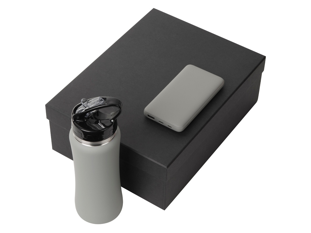 повербанк- пластик с покрытием soft-touch, бутылка- нержавеющая cталь с покрытием soft-touch