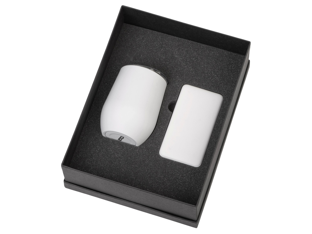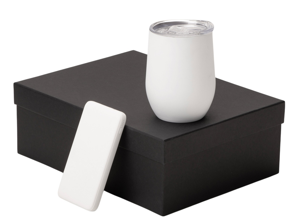 повербанк- пластик с покрытием софт-тач, термокружка- нержавеющая cталь с покрытием софт-тач
