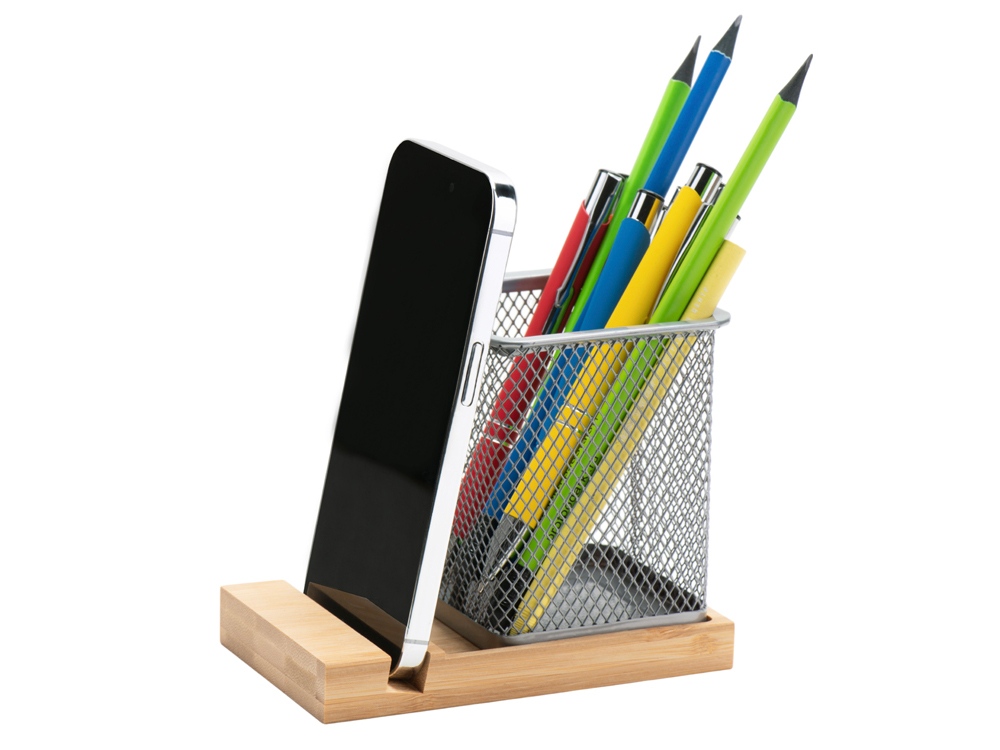 Функциональная подставка для ручек и карандашей, выполнена из прочного алюминия и установлена на бамбуковой основе. Элегантный дизайн этой подставки позволяет поддерживать порядок на вашем рабочем столе, обеспечивая легкий доступ к необходимым канцелярским принадлежностям.