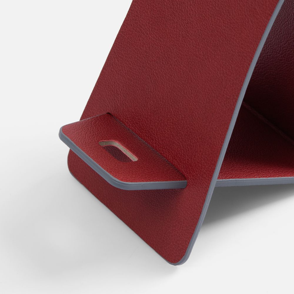 Складная подставка для телефона с вырубкой под шнур зарядного устройства. Выполнена из материала Petrus.