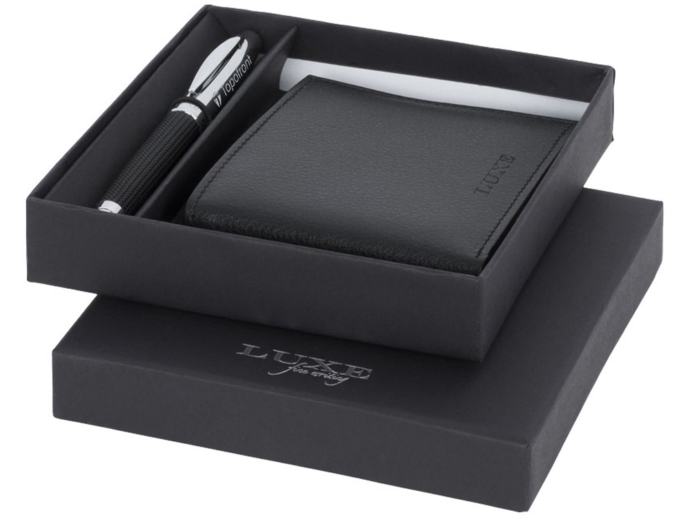 Подарочный набор из шариковой ручки и кошелька. Два необходимых предмета в одном стильном подарочном наборе. Шариковая ручка с кожаным покрытием с бумажником. Эксклюзивный дизайн. Предлагается в подарочной коробке LUXE. Металл и искусственная кожа. -
