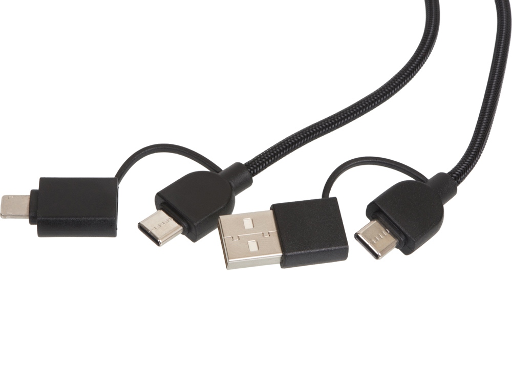 Кабель оснащён всеми популярными типами разъёмов — USB-C, USB-A, Lightning — что позволяет использовать его с широким спектром устройств: смартфонами, планшетами, наушниками, портативными колонками и другими гаджетами.