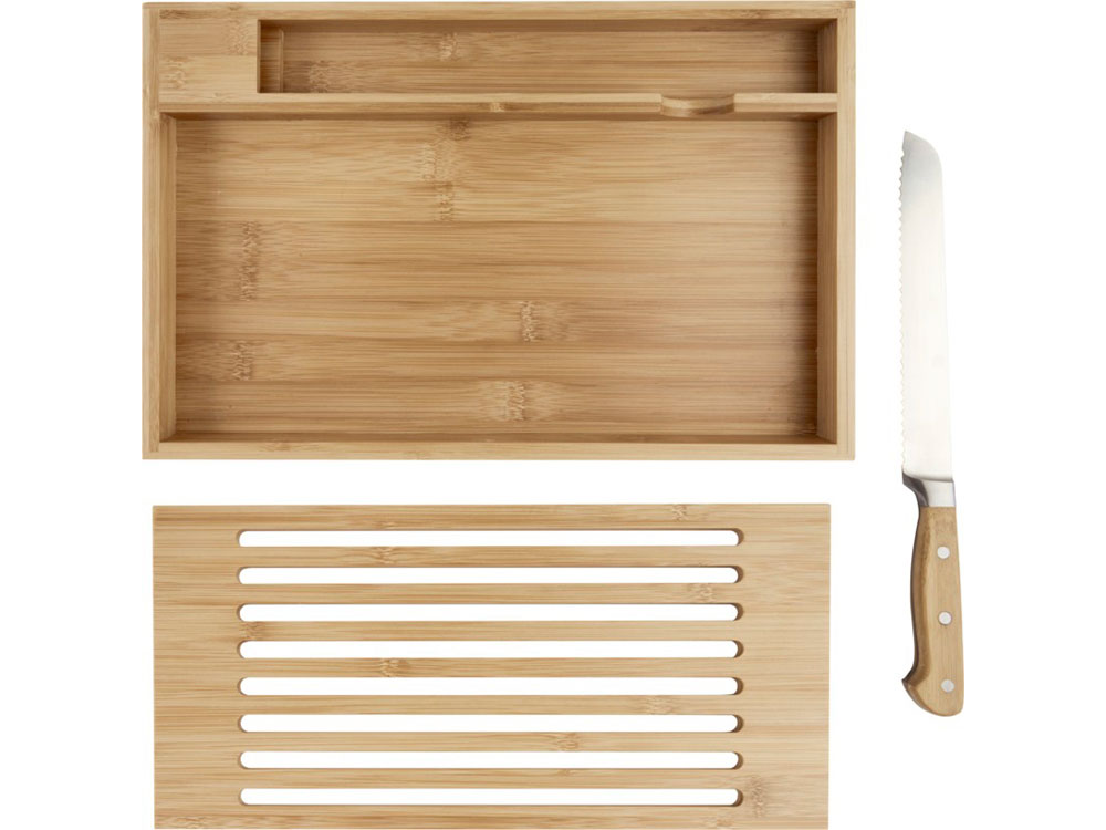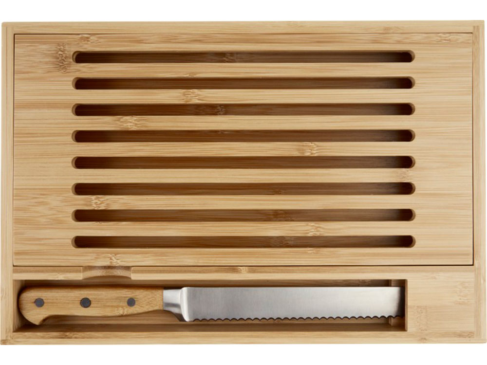 Бамбуковая разделочная доска с хлебным ножом с бамбуковыми ручками. Благодаря горизонтальной открытой модели крошки падают в поддон, что позволяет сохранить рабочее место или обеденный стол чистым. Размер ножа: 34 x 3 см. Бамбуковое дерево, нержавеющая сталь. -