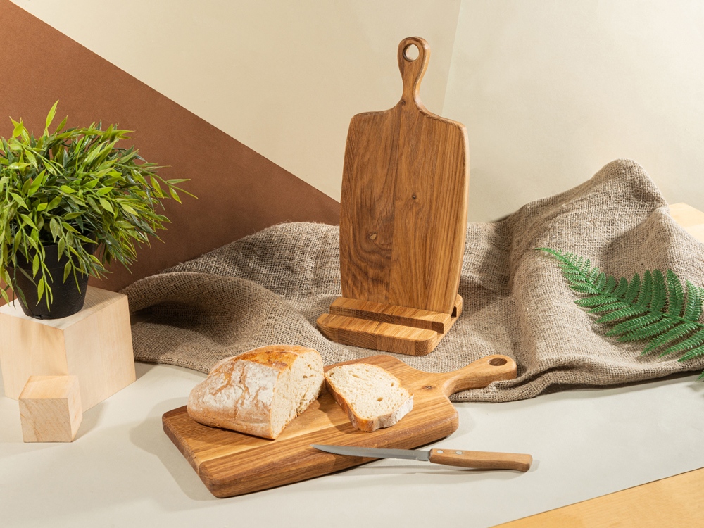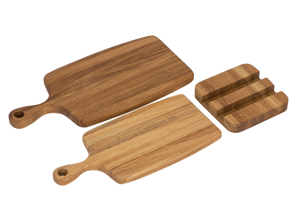 Набор от Eat&Bite состоит из двух разделочных досок из натурального дуба, а также подставки для них. Доски обработаны пищевым маслом, которое не дает древесине растрескаться и помогает поддерживать свежий вид.