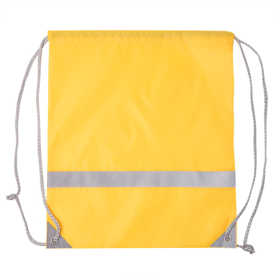 Просто и безопасно! Рюкзак-мешок RAY из полиэстера 210Dсо светоотражающей полосой спереди, светоотражающими уголками,усиленными металлическими люверсамиЛегко и просто затягивается по верхней части серыми шнурами.Жёлтый цвет близкий к Pantone 116C -
