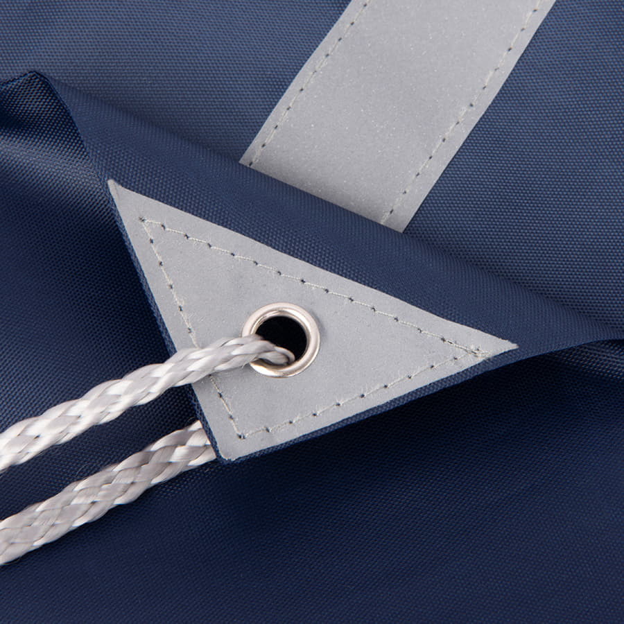 Просто и безопасно! Рюкзак-мешок RAY из полиэстера 210Dсо светоотражающей полосой спереди, светоотражающими уголками,усиленными металлическими люверсамиЛегко и просто затягивается по верхней части серыми шнурами.Тёмно-синий цвет близкий к Pantone 289C -