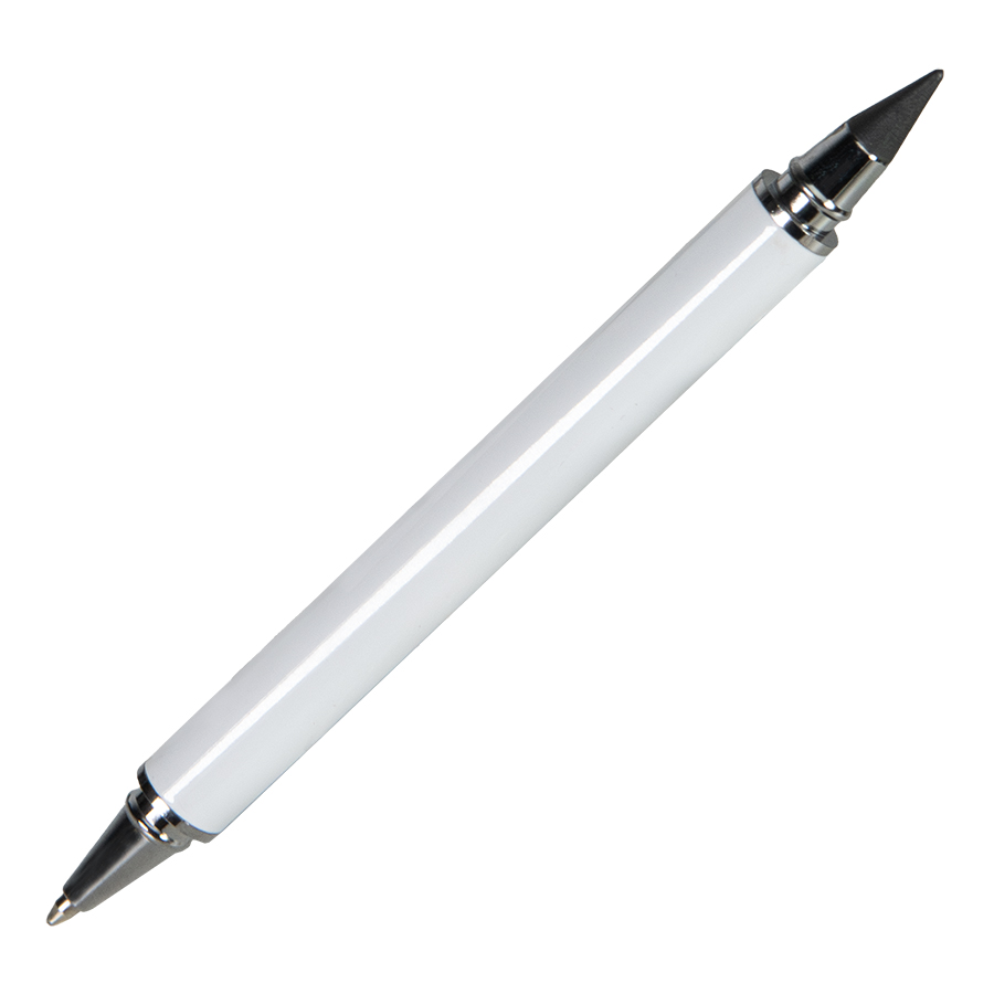 Функциональная модель 2 в 1. С одной стороны - это ручка, а с другой - вечный карандаш. Идеальный выбор рациональных людей, как для промо мероприятия, так и в качестве бизнес подарка. Так как гораздо выгоднее приобрести один пишущий инструмент, в котором будет и ручка, и вечный карандаш, нежели покупать их по отдельности.• Цвет, близкий к Pantone White• Размер φ 10 x 136 мм• Корпус и колпачки из алюминия• С одной стороны ручка, с другой - вечный карандаш• Длина линии письма ручки 800-1000 м• Пулевидный пишущий узел 1.0 мм• Цвет чернил синий• Сменный стержень Parker type• Упаковка: транспортный картонный футляр, претензии по качеству транспортировочной упаковки не принимаются• Виды нанесения: гравировка -