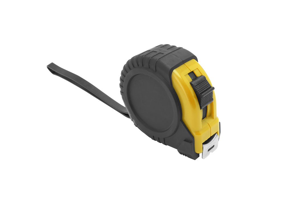 5-метровая рулетка с фиксирующим механизмом. Цветной прорезиненный корпус с резиновым чехлом, металлический зажим и ремешок для переноски. -
