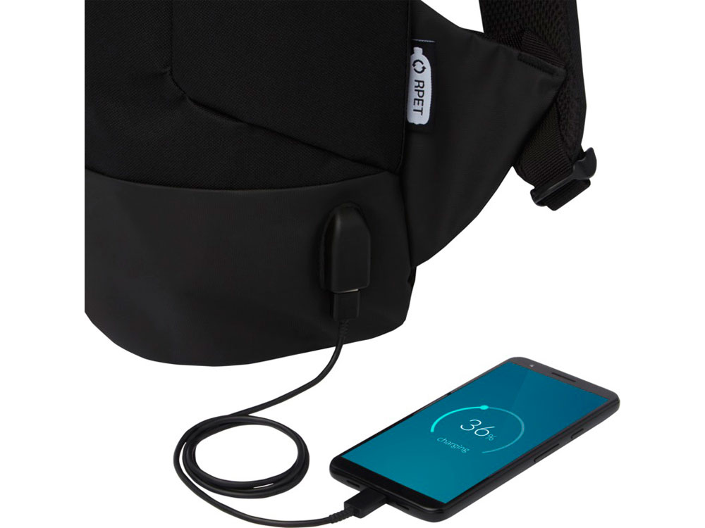 Рюкзак оснащен противокражный конструкцией – молния основного отделения смещена к спинке. Кроме этого 2 кармана рюкзака оснащены системой от несанкционированного считывания данных RFID. В основном отделении расположен органайзер и плотный карман для ноутбука 15’’. USB порт на правой стороне для удобного подключения и зарядки устройств изнутри. С мягкими плечевыми ремнями, скрытым карманом на молнии, ручкой для переноски и ремнем для крепления к чемодану. Изготовлен из переработанного пластика – на изготовление ушло 15 пластиковых бутылок.