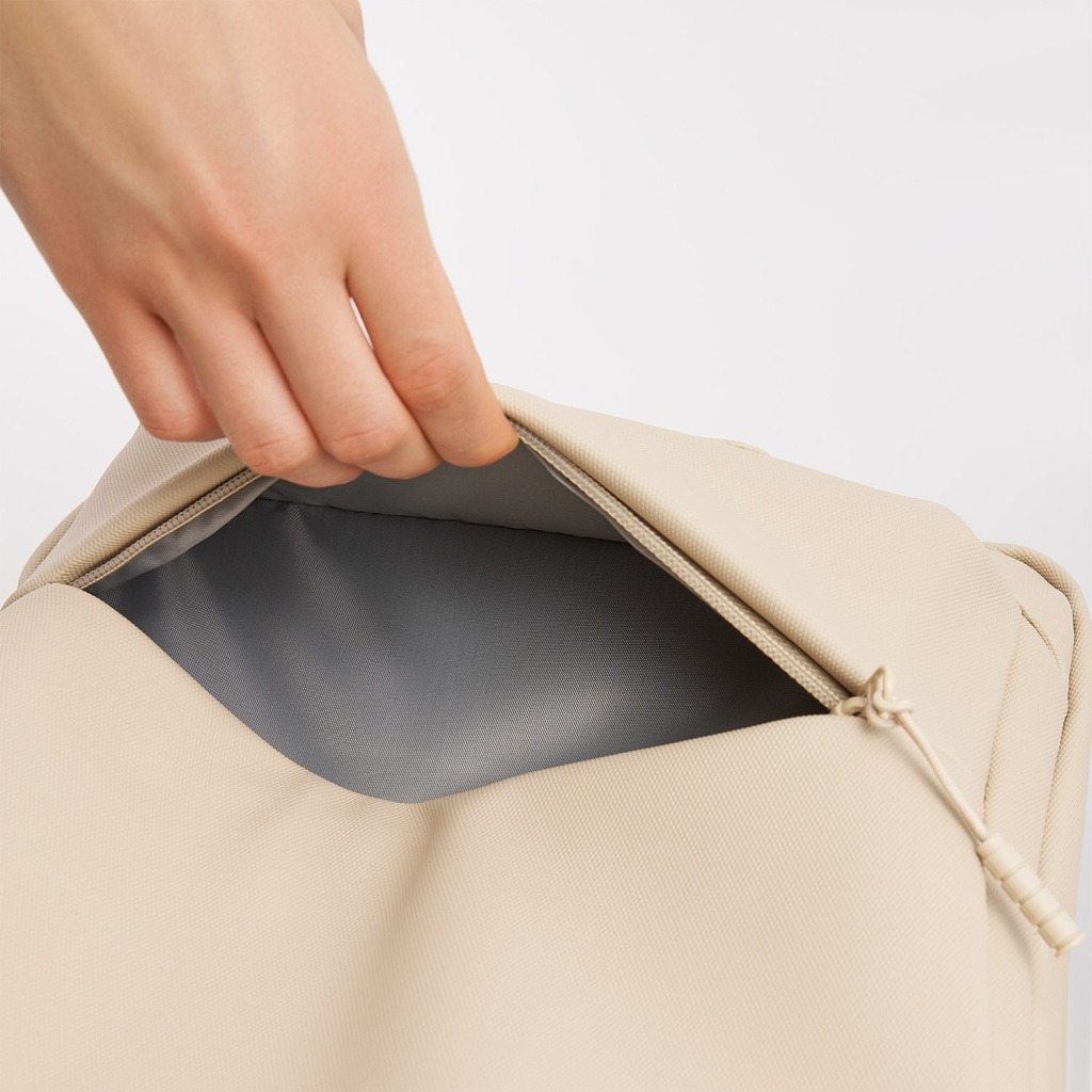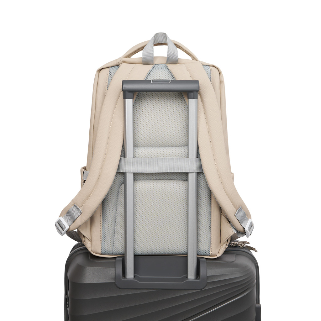 На внешней стороне расположен глубокий карман на скрытой молнии для хранения мелочей, а боковые карманыоснащены фиксаторами для комфортной эксплуатации. Есть багажная лента на спинке. Рюкзак имеет две мягкие регулируемые лямки, а верхняя мягкая ручка дополнена ручкой-петлёй.