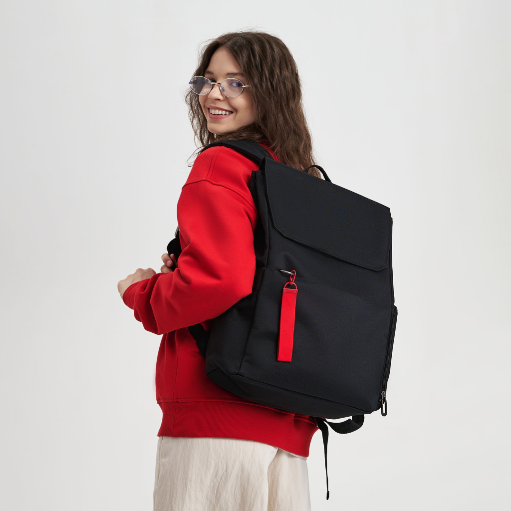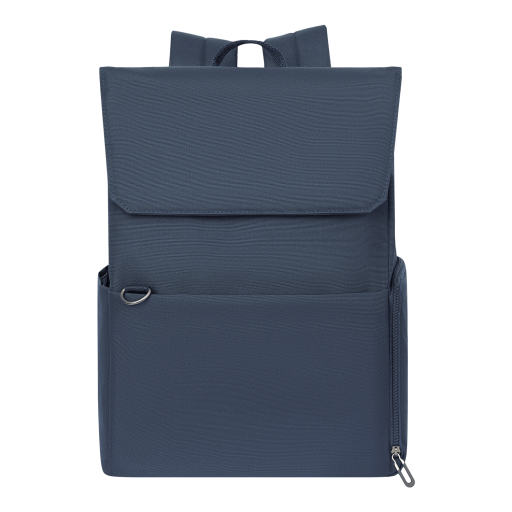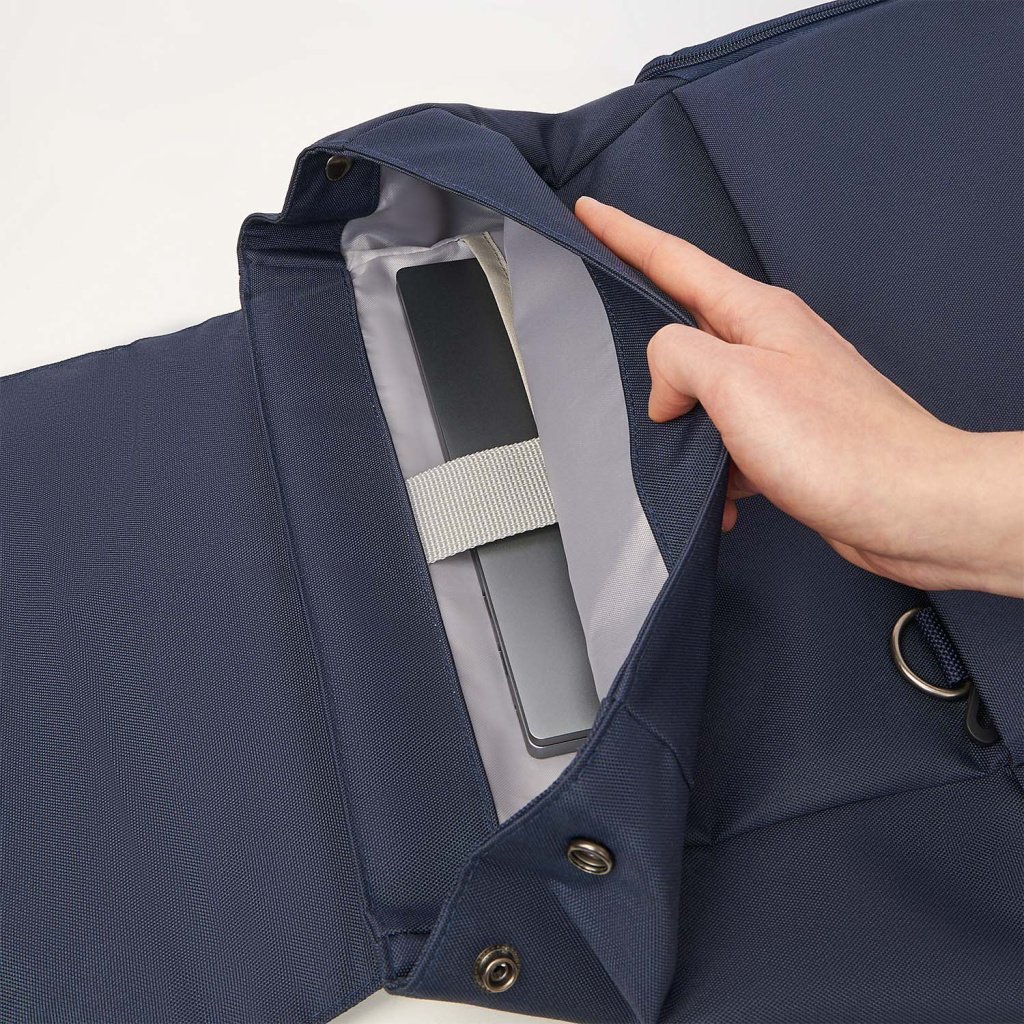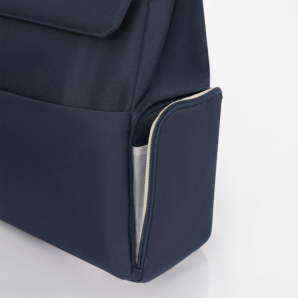 Основное отделение вмещает ноутбук до 15,6 дюймов в уплотненном кармане с фиксирующим ремнем на липучке. Внутри основного отделения есть карман для фиксации пластиковой бутылки или небольшого термоса. Боковые карманы разного типа — один объемный на молнии, второй плоский — позволяют удобно разместить все необходимые вещи.