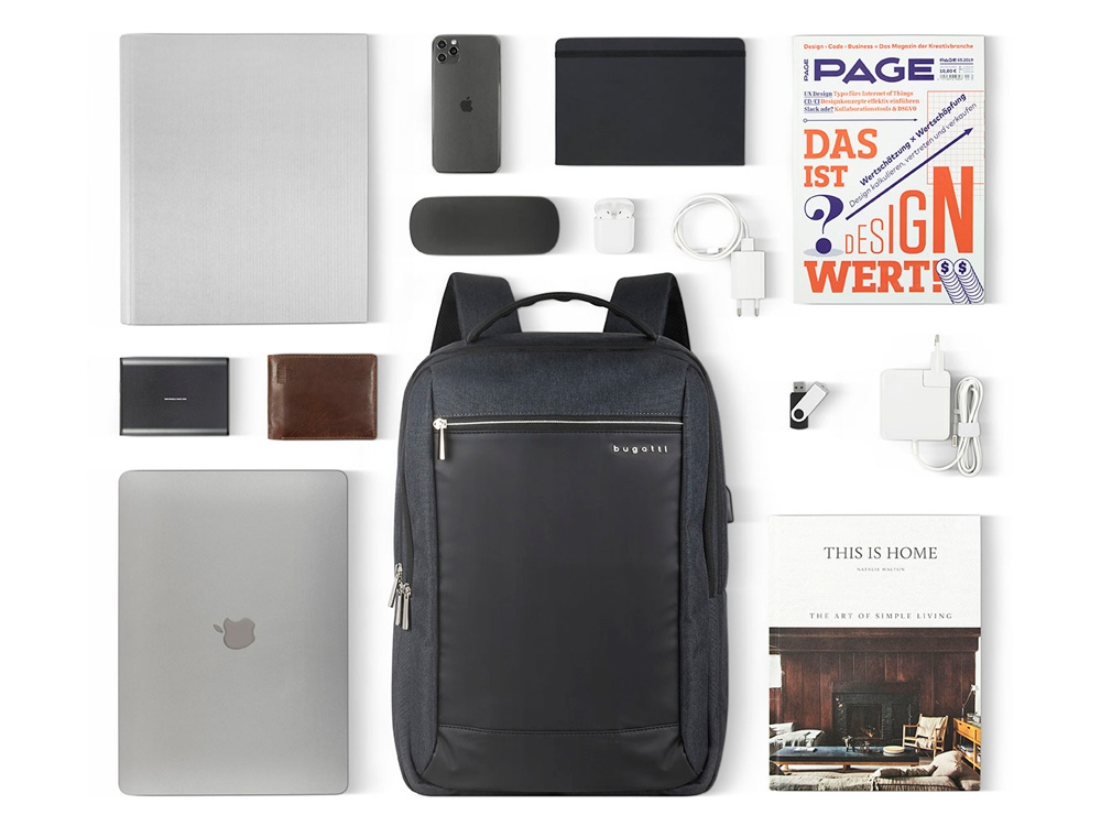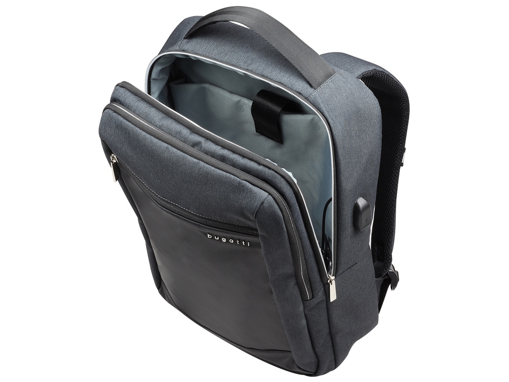 Внутренняя организация: отделение на молнии с USB-портом и мягким отделением для ноутбука 15’’, отделение на молнии с открытым карманом и карманом-органайзером (открытый карман, 3 слота для карточек, 2 держателя для пишущих принадлежностей)