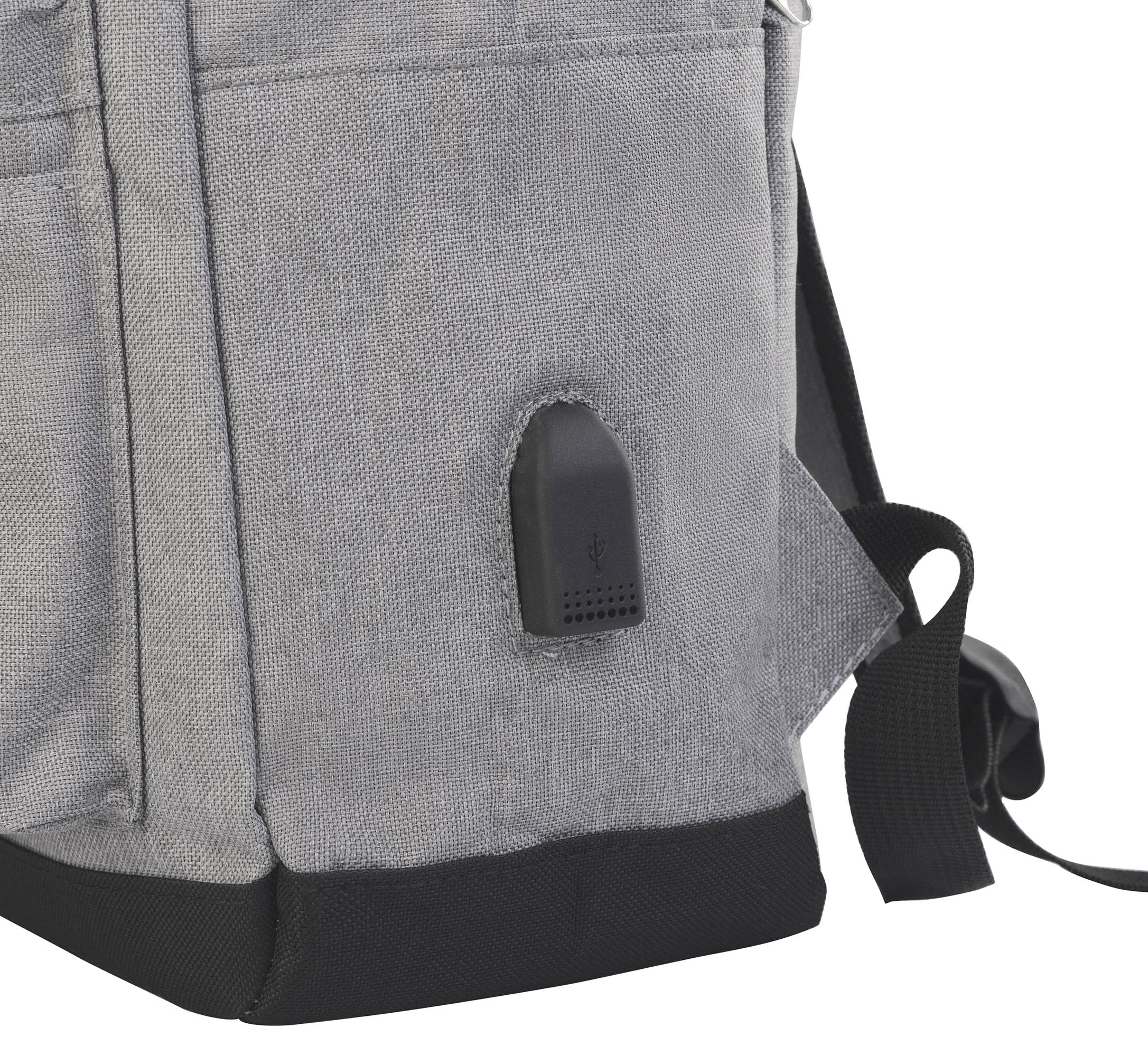Достаточный объём и несколько отделений рюкзака позволят вместить всё самое необходимое. Основной материал - полиэстер плотностью 600 D хорошо держит форму и устойчив к сминанию. Прорезиненная подложка надежно защищает содержимое от влаги. Есть внешний карман на молнии, карман-сетка с боковой стороны и выход для проводов с противоположной стороны. Основное отделение имеет скрытую молнию и внутри – карман с RFID-защитой. Внутренний подклад – серого цвета.
