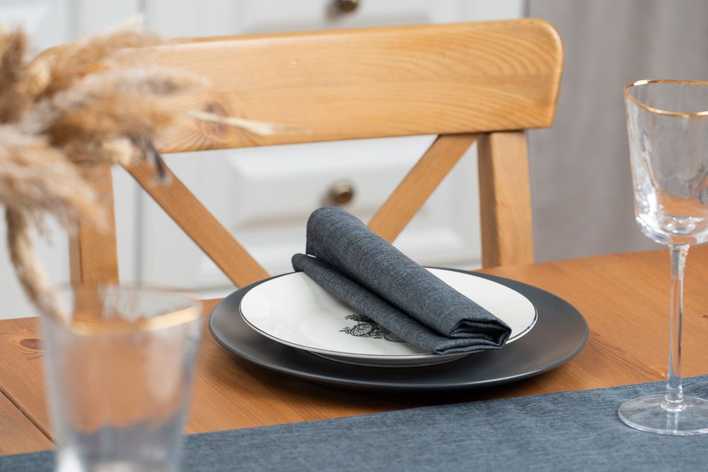 Износостойкая ткань, имитирующая лен, обработана пропиткой от грязи и воды, что делает ее применение для кухни и дома практичным, а уход — легким.