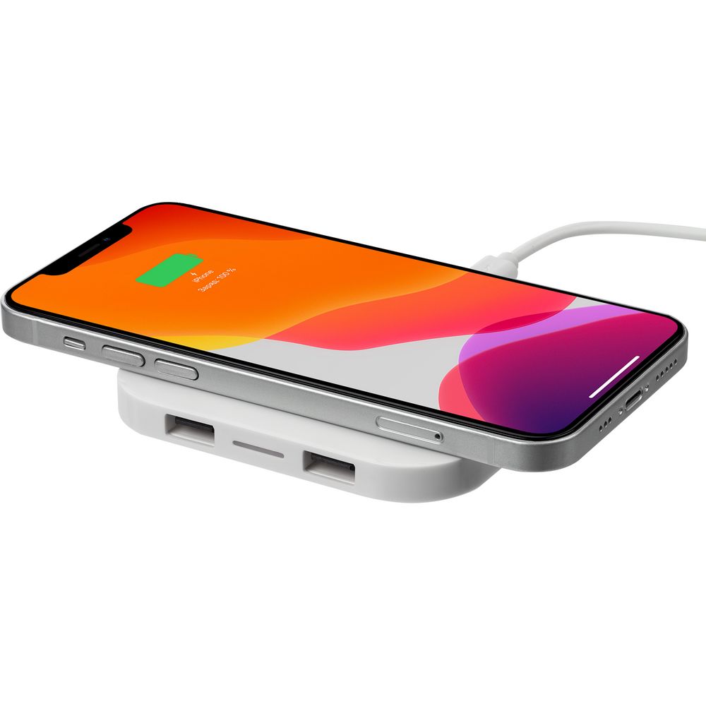 При подключении к внешнему сетевому адаптеру светодиодный индикатор мигнет два раза: устройство Interra Plus готово к размещению на верхней части корпуса смартфона с поддержкой беспроводной зарядки.- Модуль беспроводной зарядки и 2 порта USB