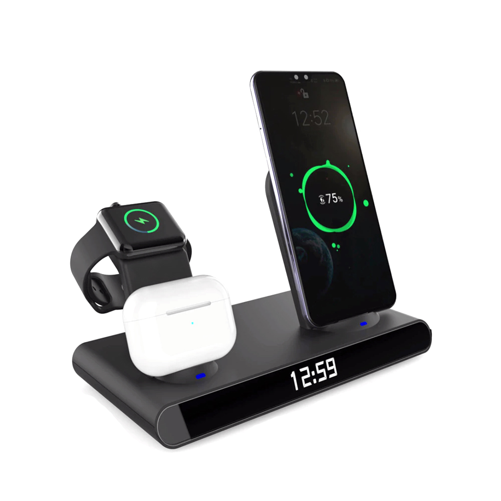 Часы электронные Abbatt мультифункциональные с беспроводной зарядкой мощностью 10W. Особенность этих электронных часов заключается в том, что они выполянют функцию не только часов и будильника, а еще с их помощью можно заряжать свои гаджеты. Удобство беспроводной зарядки говорит само за себя - очень комфортно заряжать смартфон, часы и наушники, просто положив их на зарядную станцию, не подключая при этом к ним никаких кабелей. Также есть возможность быстрой зарядки Qi. При беспроводной зарядке устройство меньше подвержено перепадам в сети, чем при подключении к розетке, тем самым увеличивается срок службы аккумулятора. Благодаря интерфейсу Type-C (шнур идёт в комплекте 1м) ваши гаджеты будут заряжаться более эффективно, а главное - одновременно. Вы можете смотреть фильмы, слушать музыку, звонить или отправлять сообщения во время всего процесса зарядки. Входы: 9V/2A 12/2A. Выходы: Беспроводной 10W / 7.5W / 5W / USB 5V / 0.8-1A / Airpod 3W / Apple watch 2.5W. Совместимость с Apple 8 и выше. Размер в упаковке: 21,5*13,5*5,5 см. Поддерживаемые устройства: 1) Область зарядки смартфона поддерживает все Android/Ios устройства с функцией беспроводной зарядки. 2) Область зарядки наушников поддерживает все Android/Ios устройства с функцией беспроводной зарядки. 3) Область зарядки часов поддерживает только устройства AppleWatch Для работы беспроводной зарядки необходимо подключать устройство к сети через адаптер.- Виды нанесений: УФ-печать А2, УФ-Лак, УФ-Цвет+Лак